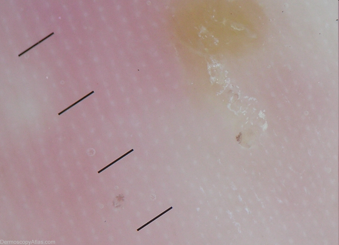 History: This infant developed a few weeks after birth this pustular eruption of the soles of the feet. Her mother and two of her brothers complained of itch. Scabies was suspected, and dermoscopy provided the proof.