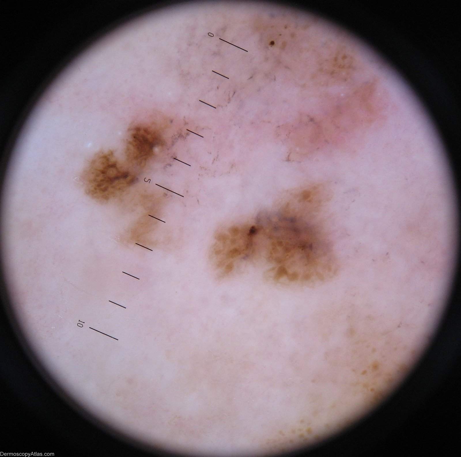 Case courtesy of Dr Greg Canning This poorly demarcated lesion is approx 5 cm in diameter and has resided on the left proximal postero medial calf of it's 72 year old owner for as long as she can remember. On reflection however she thinks it may have enlarged somewhat over the years. She has been repeatedly reassured about it by the doctors who have treated her numerous non melanoma skincancers.