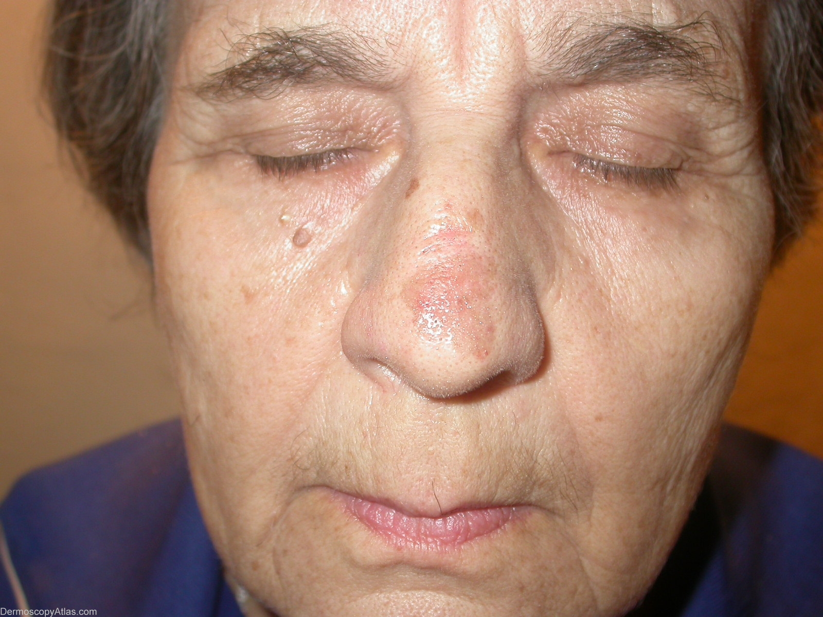 Dermoscopic description: Rhomboidal structures, asymmetric pigmented follicular openings, multiple gray dots,