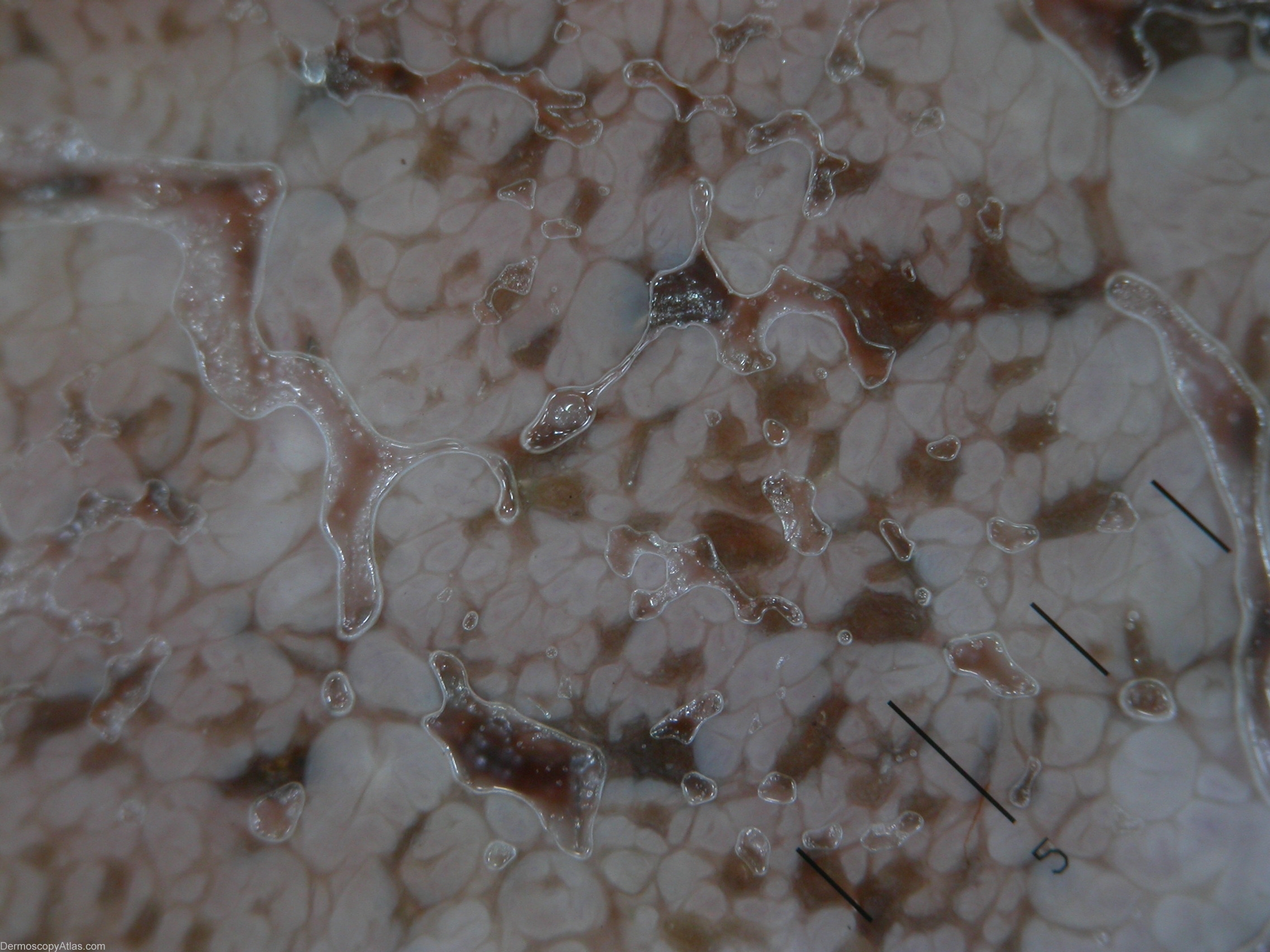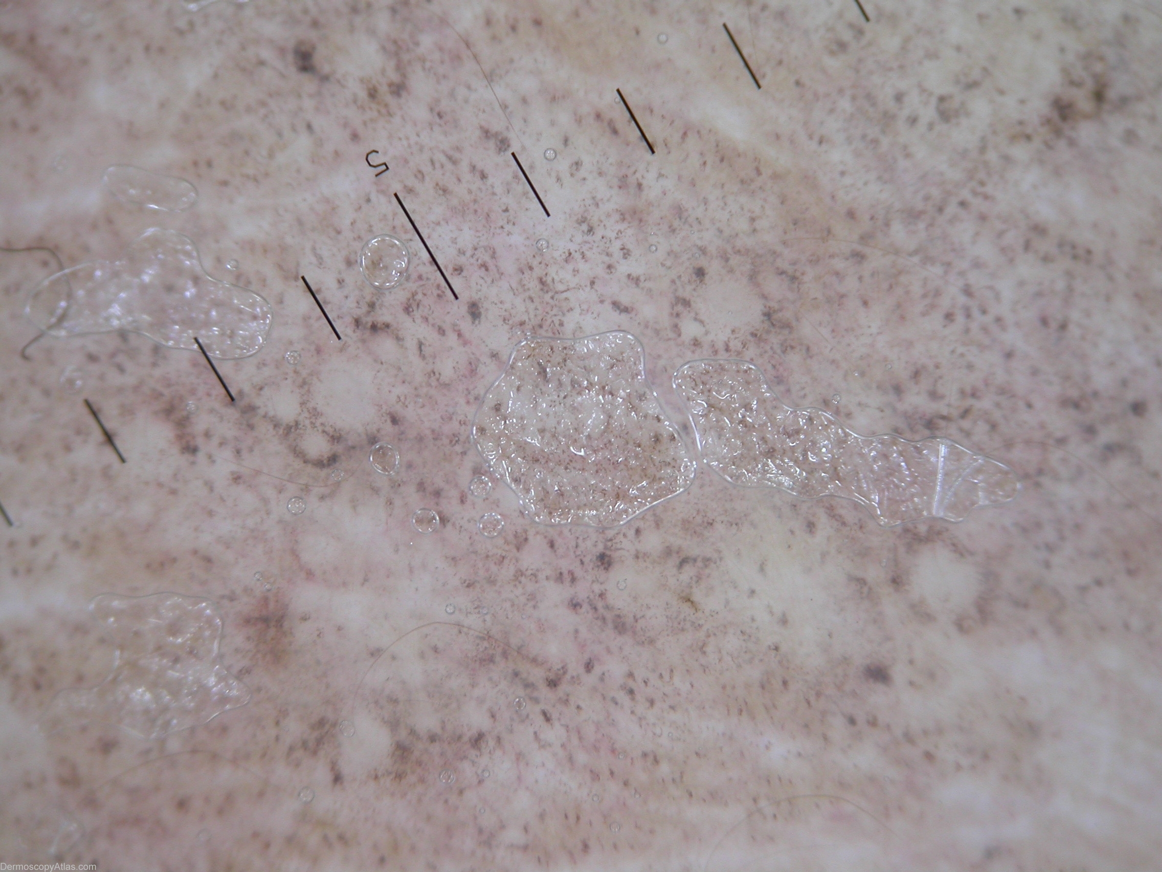 Dermoscopic description(AN): Exophytic papillary structures, multiple asymmetric blotches and milia like cysts.
