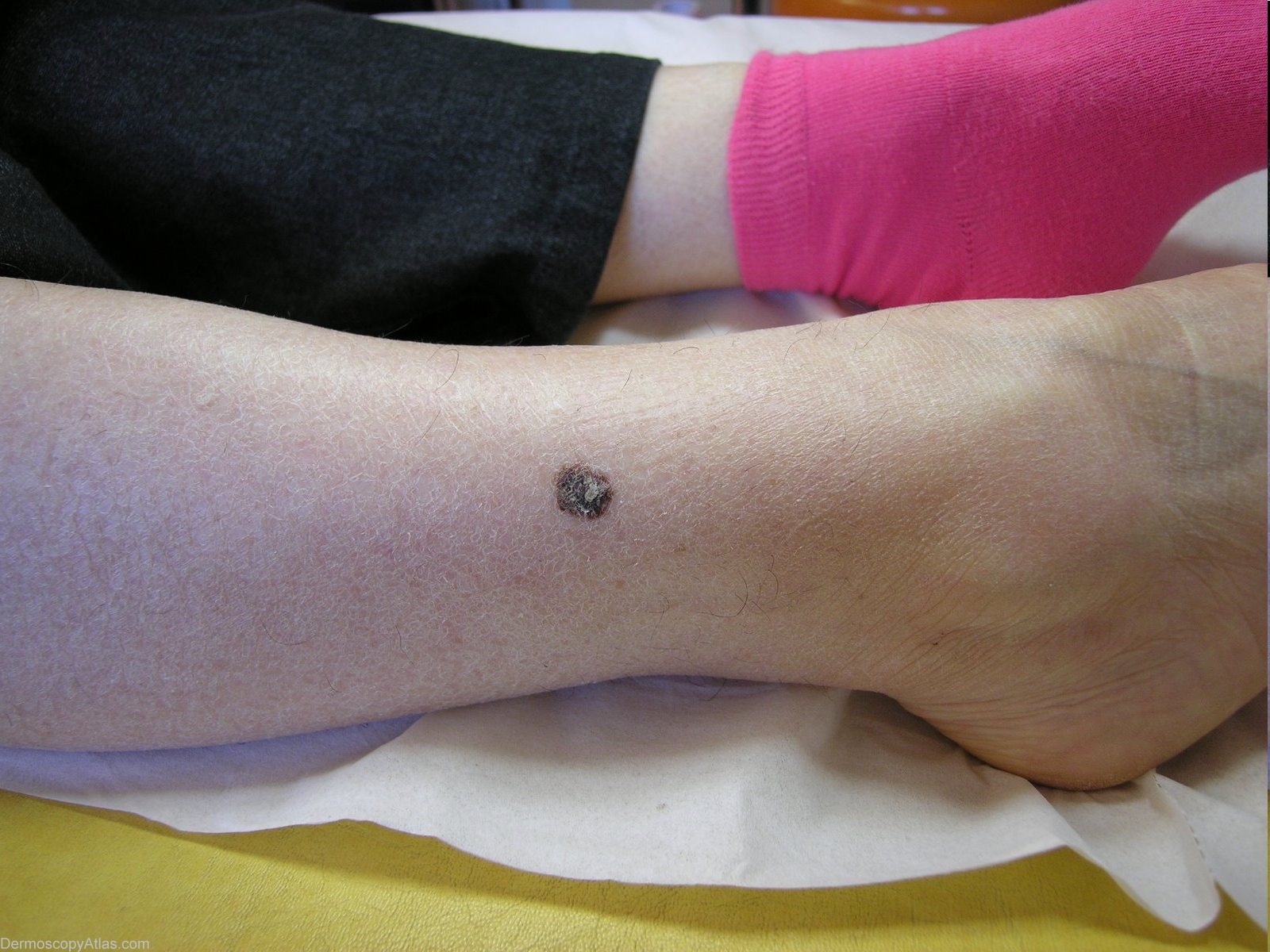 History: This 60 years old lady consulted for this black mole of her right leg. She could not give a precise history. The main dermoscopic feature was a blue white veil. The pathology showed a melanoma: SSM type, Breslow 1.28, Clark IV, no regression