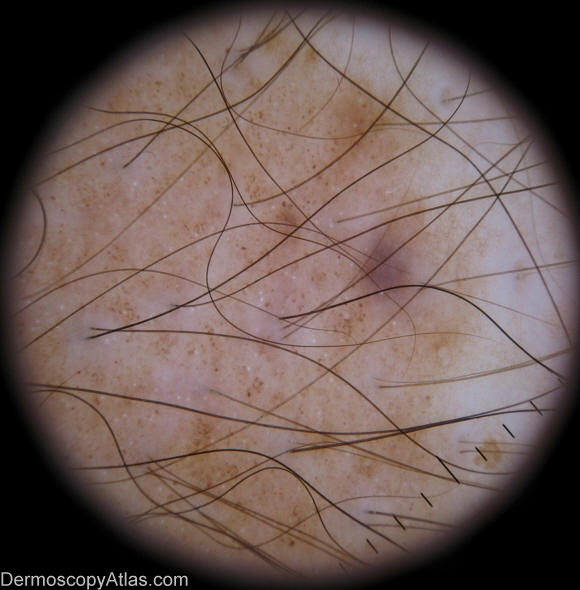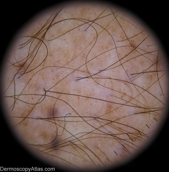 Dermoscopic pattern: Diffuse brown pigmentation with some network fragments and few remnant globules.It also shows hypertrichosis.