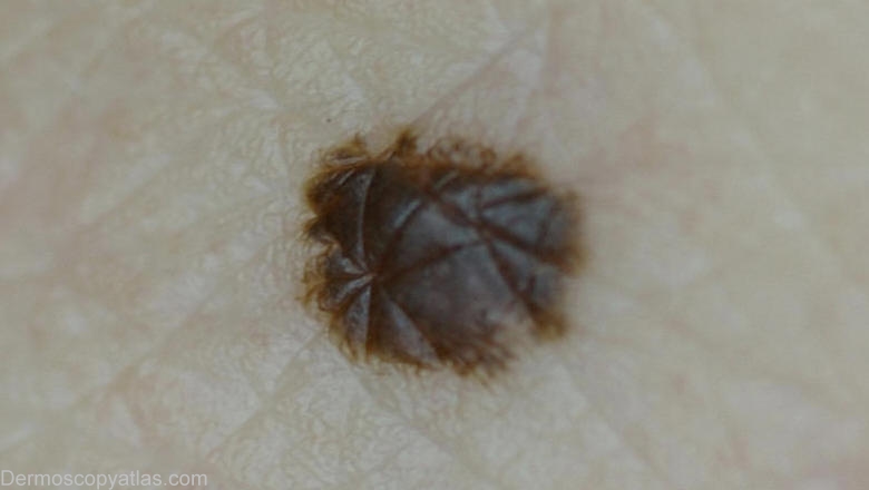 Description: Dermoscopy- Homogenous brown pigmentation and typical reticular pigment network at the periphery.