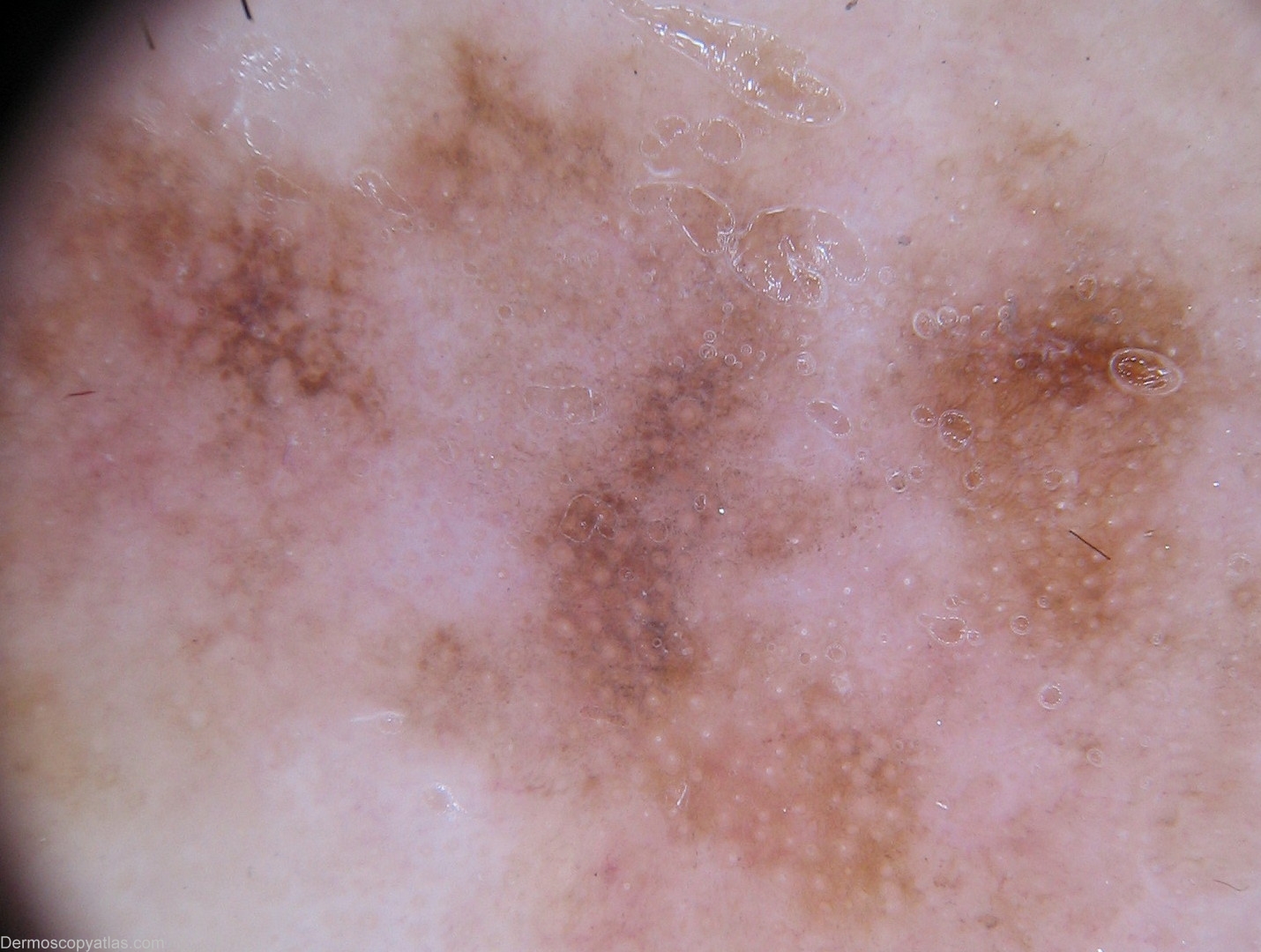 APFOs forming an annular-granular pattern (Cognetta sign) is quite common in lentigo maligna but rare in pigmented actinic keratosis and lentigo senilis(flat seborrheic keratosis).