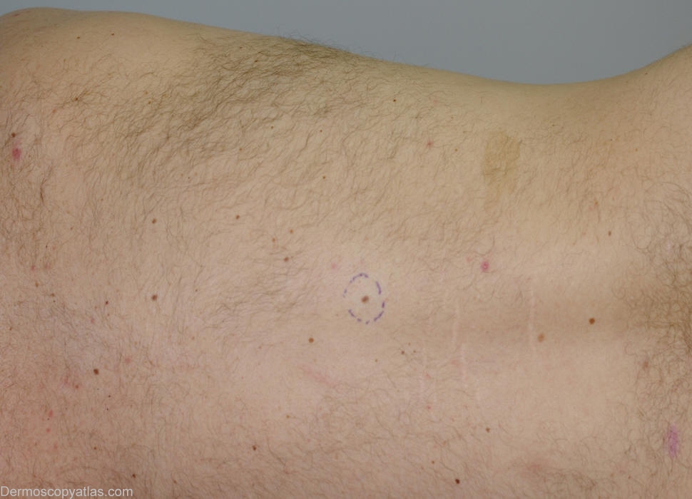 Description: Dermoscopy- Multiple brown dots and negative pigment network.