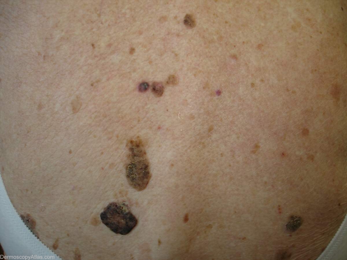 History: This lady had multiple seborrhoeic keratoses on her back but sometimes a lesion sticks out as a bit unusual. This was the juxtaposition of a deeply pigmented BCC and a seborrhoeic keratosis.