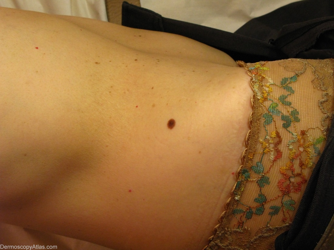 This 60 years old lady came for this mole, which was located just above her right hip. She had noticed it only recently, less than 6 months, and thought it was enlarging.