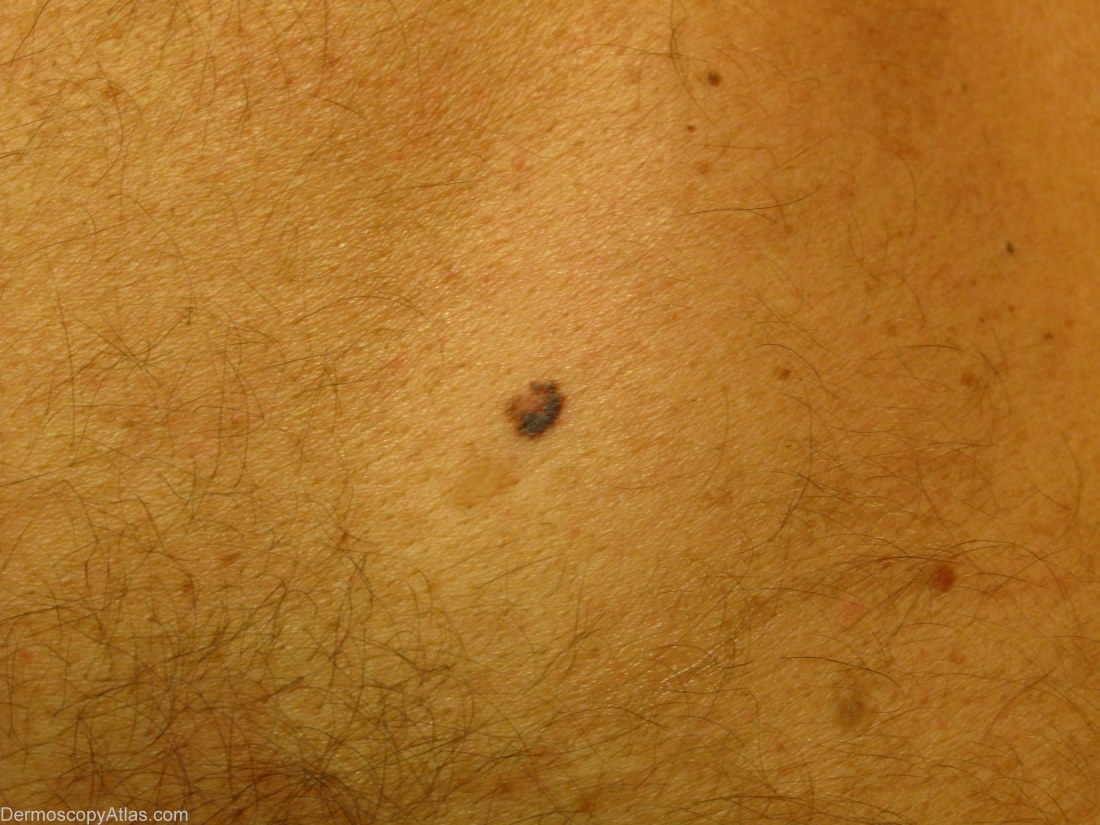 History: A 51 years old patient whose wife had noticed this small asymmetric pigmented lesion of the upper back.