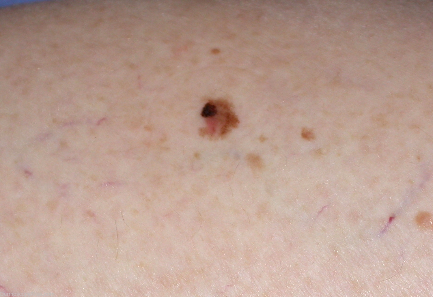 History: Patient presented with lesion on calf enlarging over a few months. Clinical examination shows aymmetrical pigmented lesion. Histology was reported as — Sections confirm level 2 superficial spreading malignant melanoma arising in a dysplastic compound naevus. There is incipient ulceration. The Breslow thickness is approximately 0.55mm. There is a very occasional dermal mitosis and there is evidence of regression.