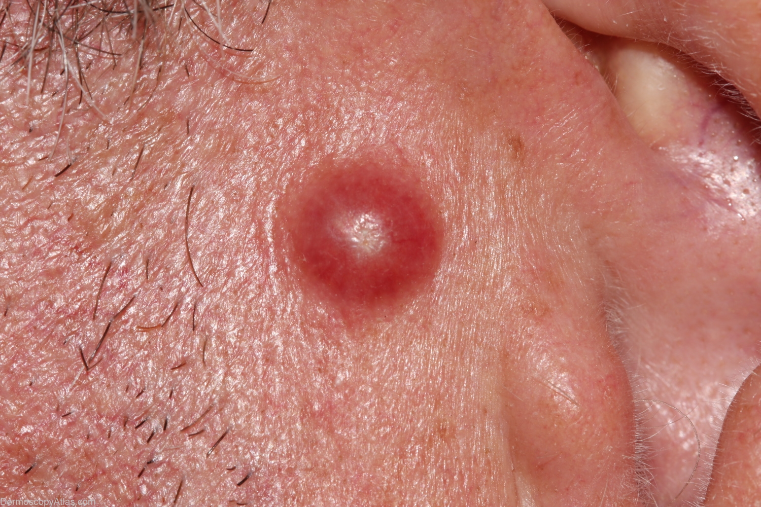 History: Rapidly enlarging preauricular nodule, arising over only 2 weeks. History suggested keratoacanthoma, but histology was reported as Sections show a cystic basal cell carcinoma with matrical differentiation. It extends into deep dermis.