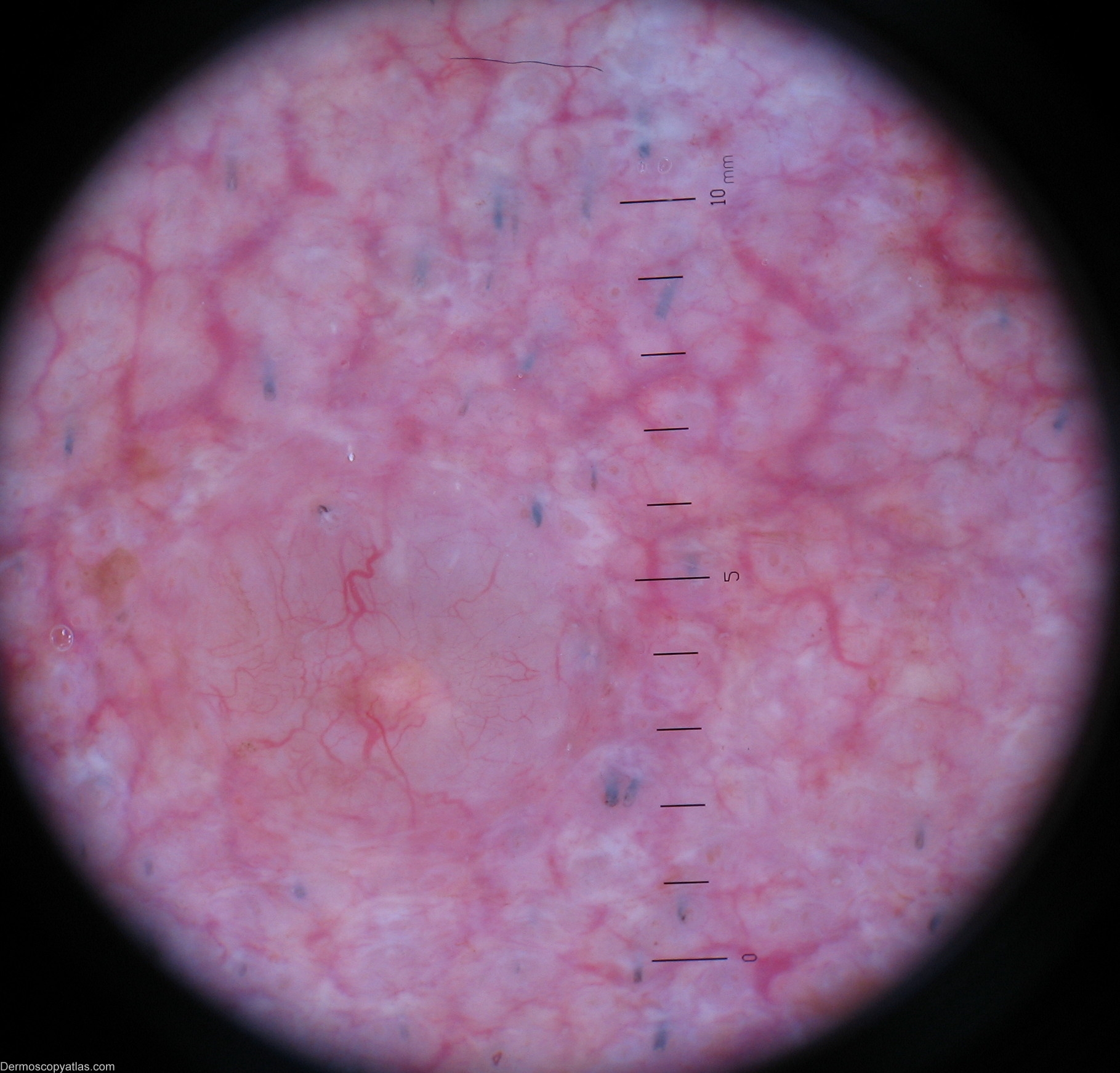 Arborizing vessels are sharply focused under the dermatoscope than the telangiectasia of the dermal plexus.Facial skin has thinning of the epidermis due to long-term U-V light exposure,causing dermal papillae and rete ridges to disappear.Facial skin vessels appear slightly blurred and also show a pink hue.