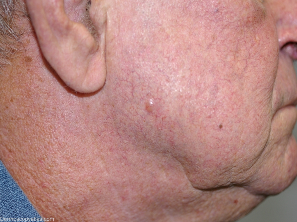 Presented with occasional bleeding from the lesion on his right cheek of 3-4 months duration.He is a retired carpenter and has had few non melanoma skin cancer lesions excised in the past.