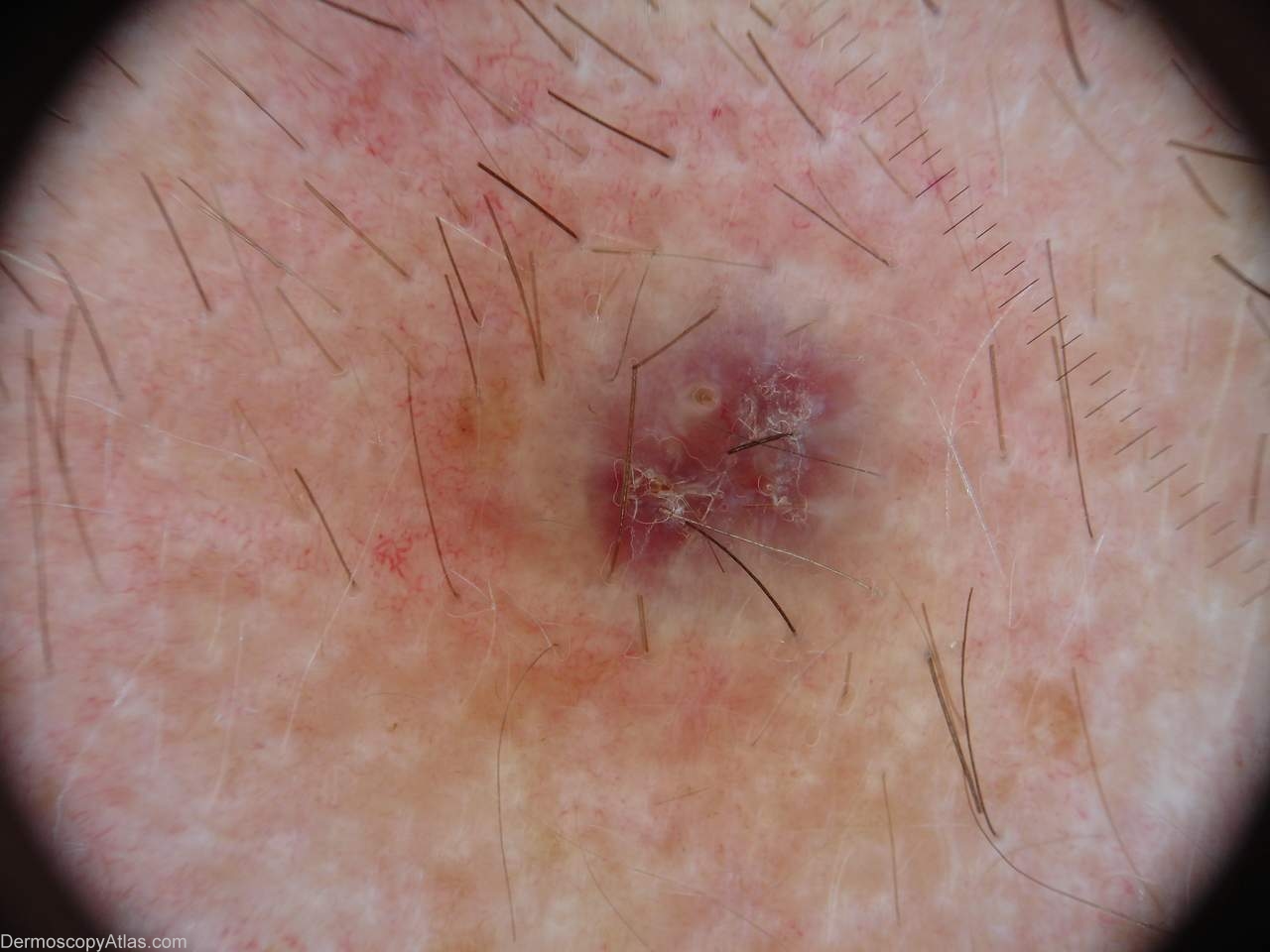 Description: Dermoscopy enlarged showing central vascular granulation tissue with surrounding fibrosis and increased peripheral vessels.
