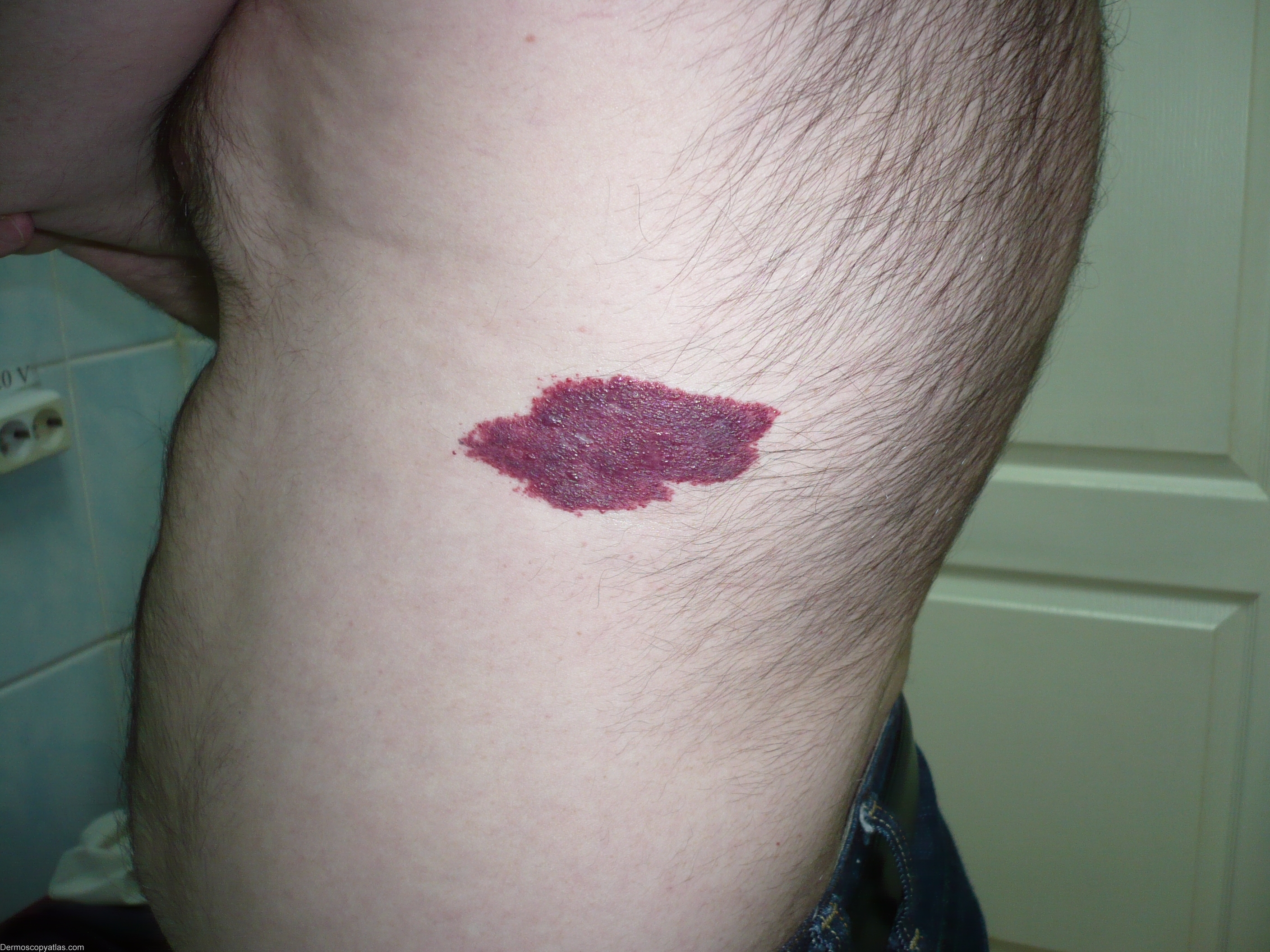 Dermoscopic description: The lesions reveal a typical lacunar pattern and white veil. In patients with CM, the pre-treatment dermoscopic evaluation enables clinicians to estimate and predict the response to laser treatment. It has been postulated that the venous plexus of CM revealing dotted and/or globular patterns without a gray-whitish veil on dermoscopy is located superficially in the upper dermis and thus predicting a good response to laser treatment. By contrast, the presence of a gray-whitish veil indicates the location of the venous malformation in the deeper parts of the dermis and treatment success should be considered unsure.