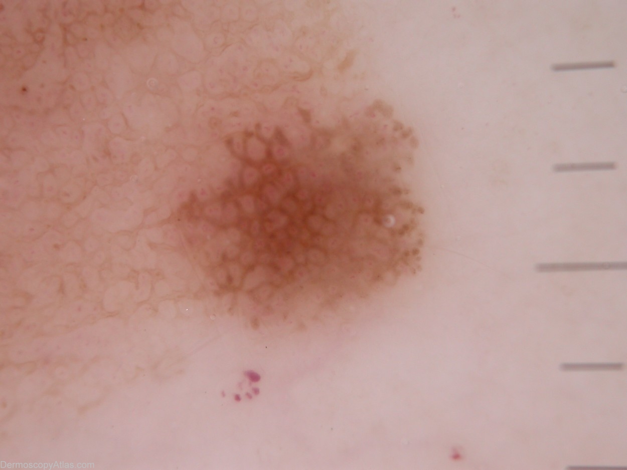 Description: This naevus has a pattern of lines reticular. In some parts there are bold lines reticular and in other parts there are subtle lines reticular but that is the pattern uniformly throughout the lesion Colour - Eccentric hyperpigmentation of dark brown in a lesion which is otherwise light brown. Clues to melanoma - None.