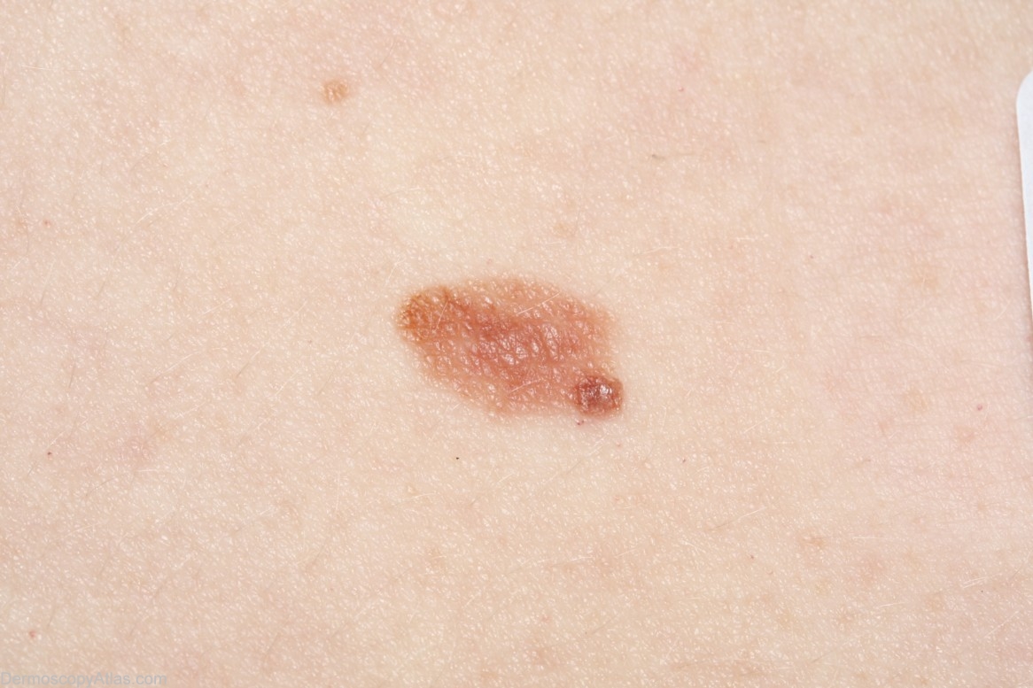 Clues: peripheral brown dots are not a clue to melanoma, because they can be found in any growing lesion. There is a possible pseudopod at the SSE, but whenever I say possible and not striking, I do not count it.
