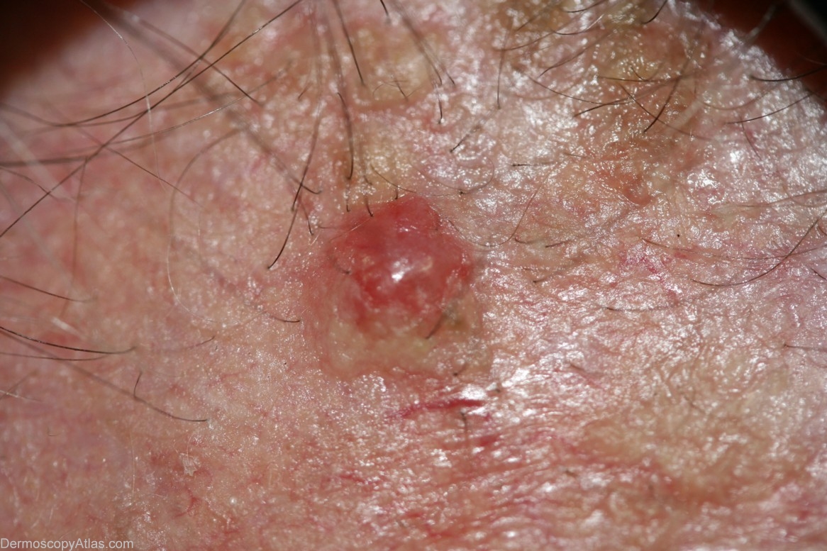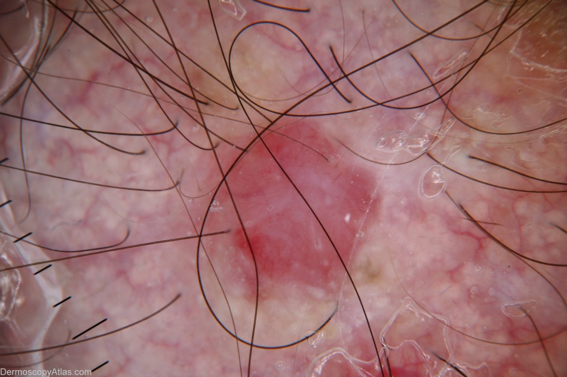 Description: Dermoscopy - This lesion is apigmented and structureless. The only dermoscopic features are a distinctive cherry colour and a few fine blood vessels