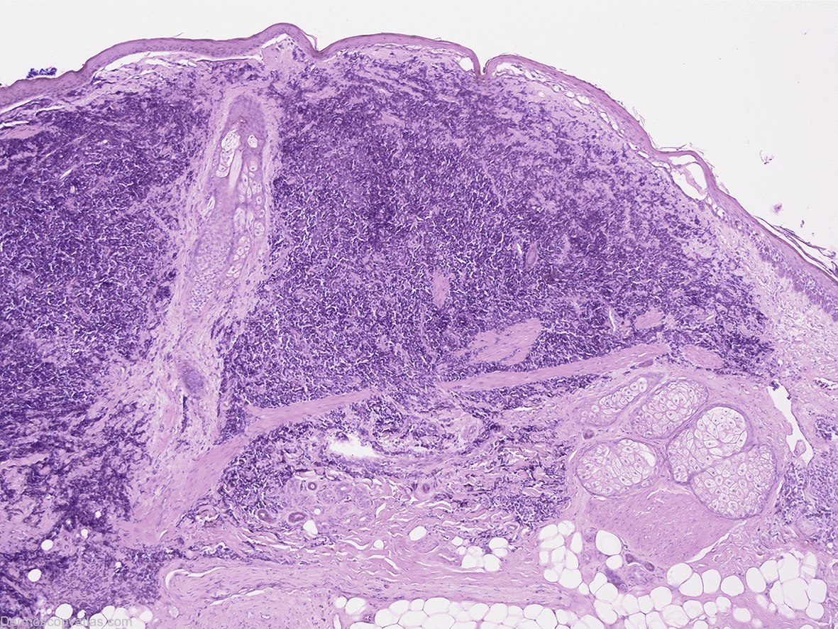 History: This 83 year old gentleman presented for a routine skin check and this lesion was discovered. Prior to biopsy this lesion was lasered without biopsy by another practitioner but subsequent wide excision of the area discovered a residual dermal based Merkel cell carcinoma at the site where this lesion had been.