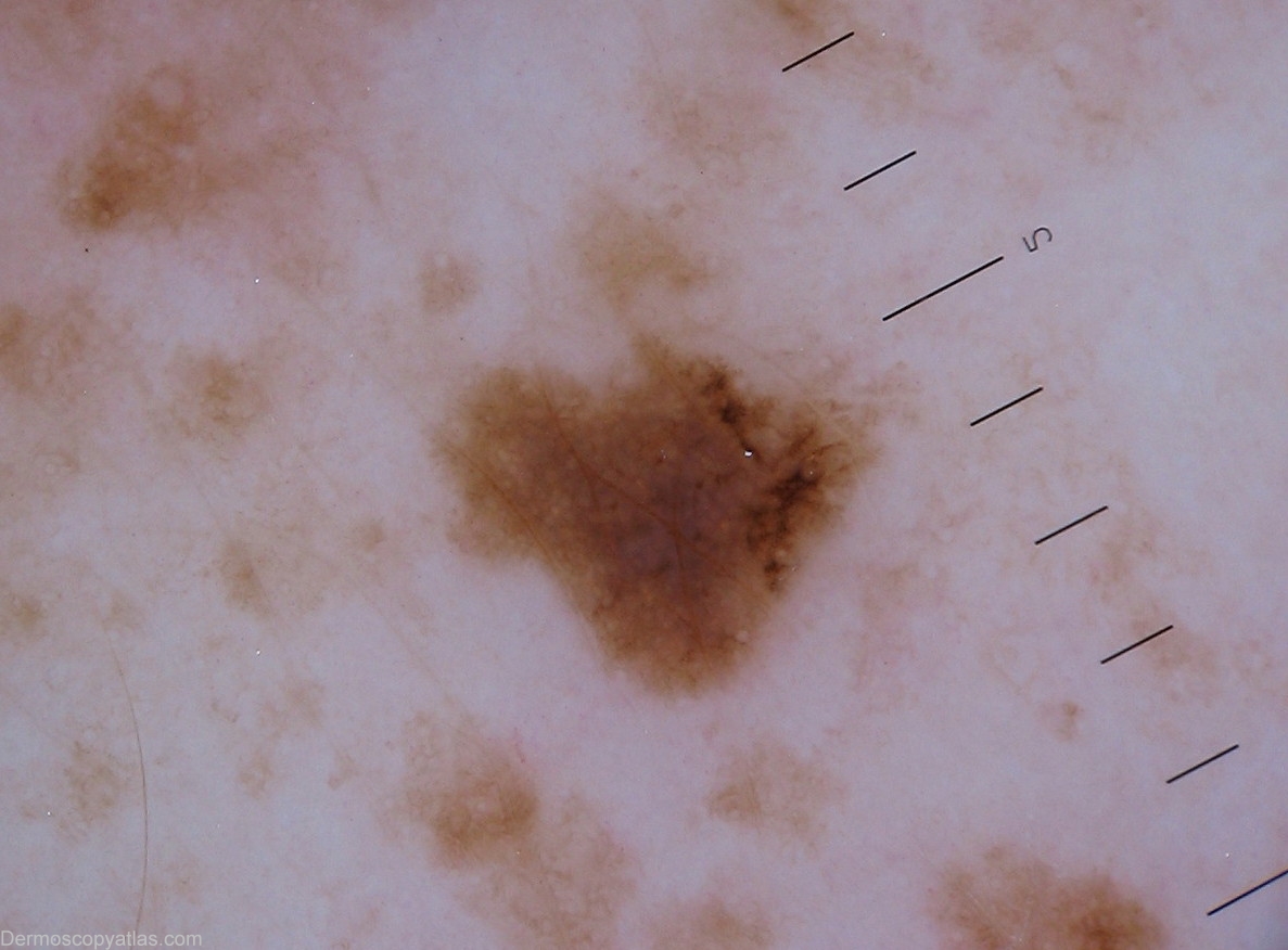 Description: Clinical - Brown macules of different sizes in peppered distribution.