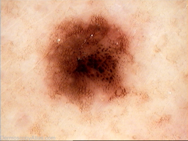 Description: Dermoscopy image Pattern - Clods (neatly aligned in rows consistent with background reticular network)and reticular lines. The clods are central and the reticular network peripheral which gives a measure of symmetry. Colours - Light brown, dark brown and black. Clues - I did wonder whether the clods amounted to thick lines reticular