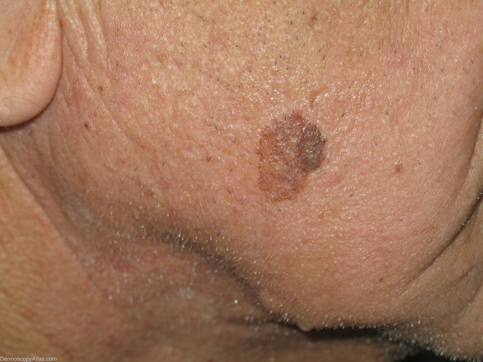 History: Lentigo solar(left part) crossing over with a seborrhoeic keratosis(right part). A 83-year-old man developed an enlarging pigmented patch of his cheek.A biopsy was performed and pathology confirmed the diagnosis of solar lentigo. Dermoscopic description: Right part(seborrhoeic keratosis)- Milia-like cysts,comedo-like openings. Left part(lentigo solar)-sharply demarcated pigmented network and moth-eaten border.
