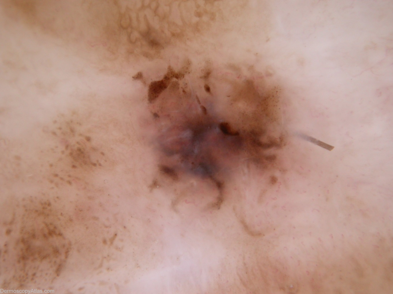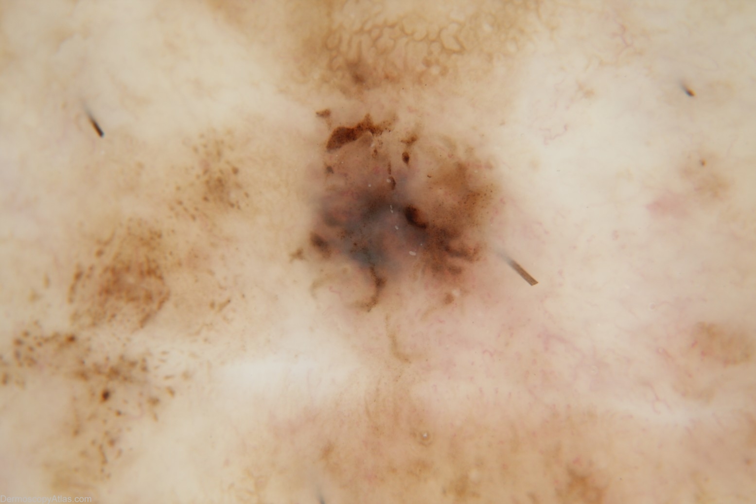 History: This 71 year old lady presented with this macule in continuity with a scar 4 years after excision of a level 4 lentigo maligna melanoma which had been excised with 1.5 mm clearance at the closest margin. The initial exision biopsy of the pigmented macule at the lower end of the scar revealed level 1 lentigo maligna melanoma involving the entirety of both margins. Two further attempts at surgical clearance resulted finally in a level 1 lentigo maligna melanoma with lateral clearance of greater than 10 mm.