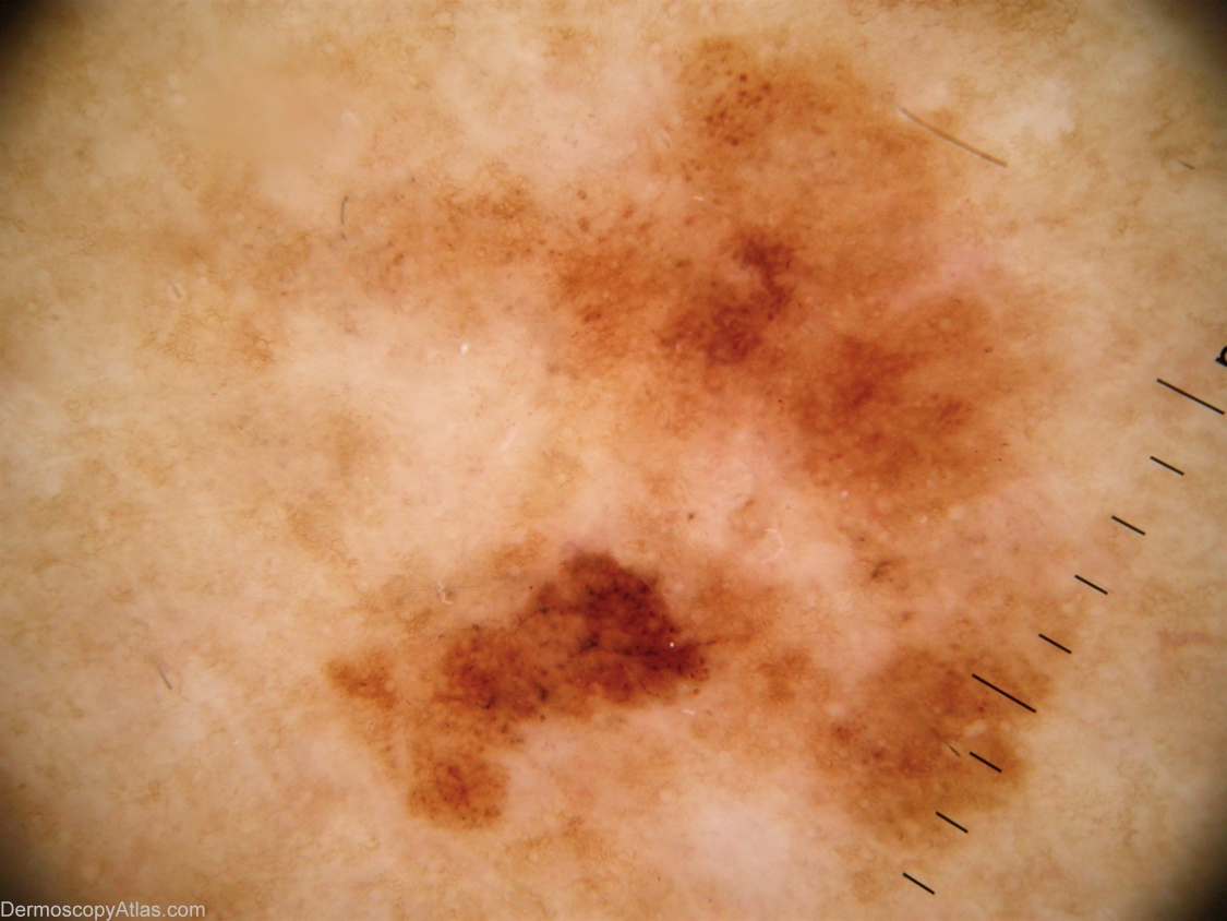 Description: Non-polarising, dermlite fluid. Presence of multiple white clods (milia-like cysts) and lack of clear network make a misdiagnosis of seborrhoeic keratosis possible.