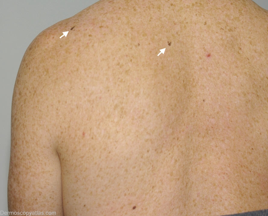 Inkspot lentigo usually situated on the back and occurs as a solitary black lesion.