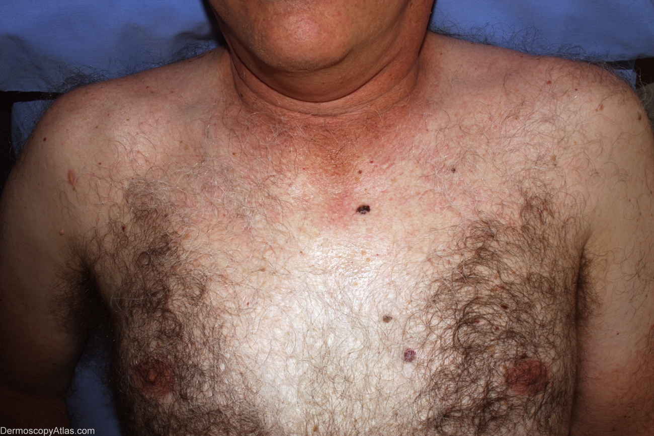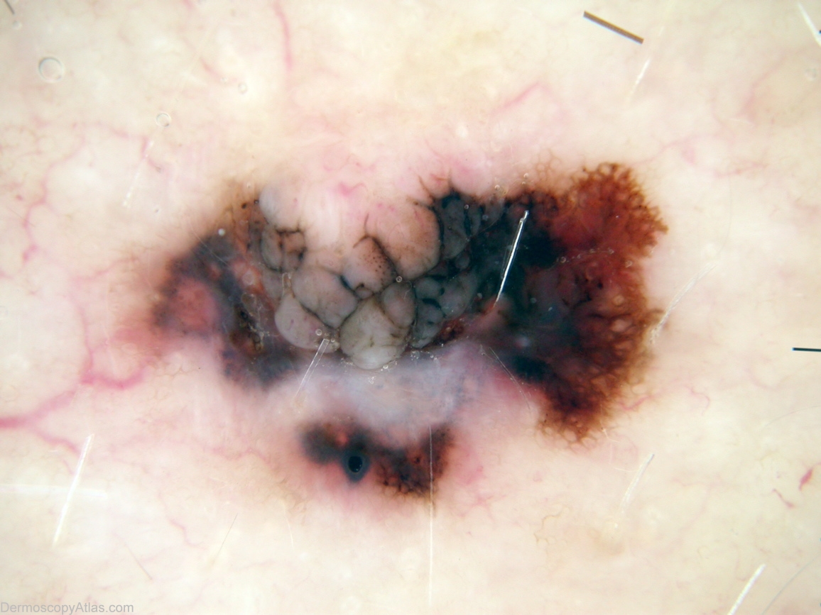 Description: Pattern is lines reticular thick and thin with segmental lines radial(top right), brown dots and structureless white. The intradermal naevus can be clearly seen top middle with brown and black lines demarcating sections of naevus, and brown dots in one section. Professor Weedon comments that melanoma barely involves this intradermal naevus, having skirted all around it. White 'clod' inferior to bright hair is artefact.