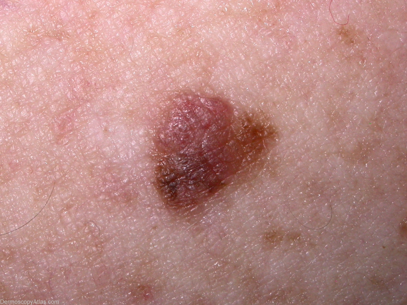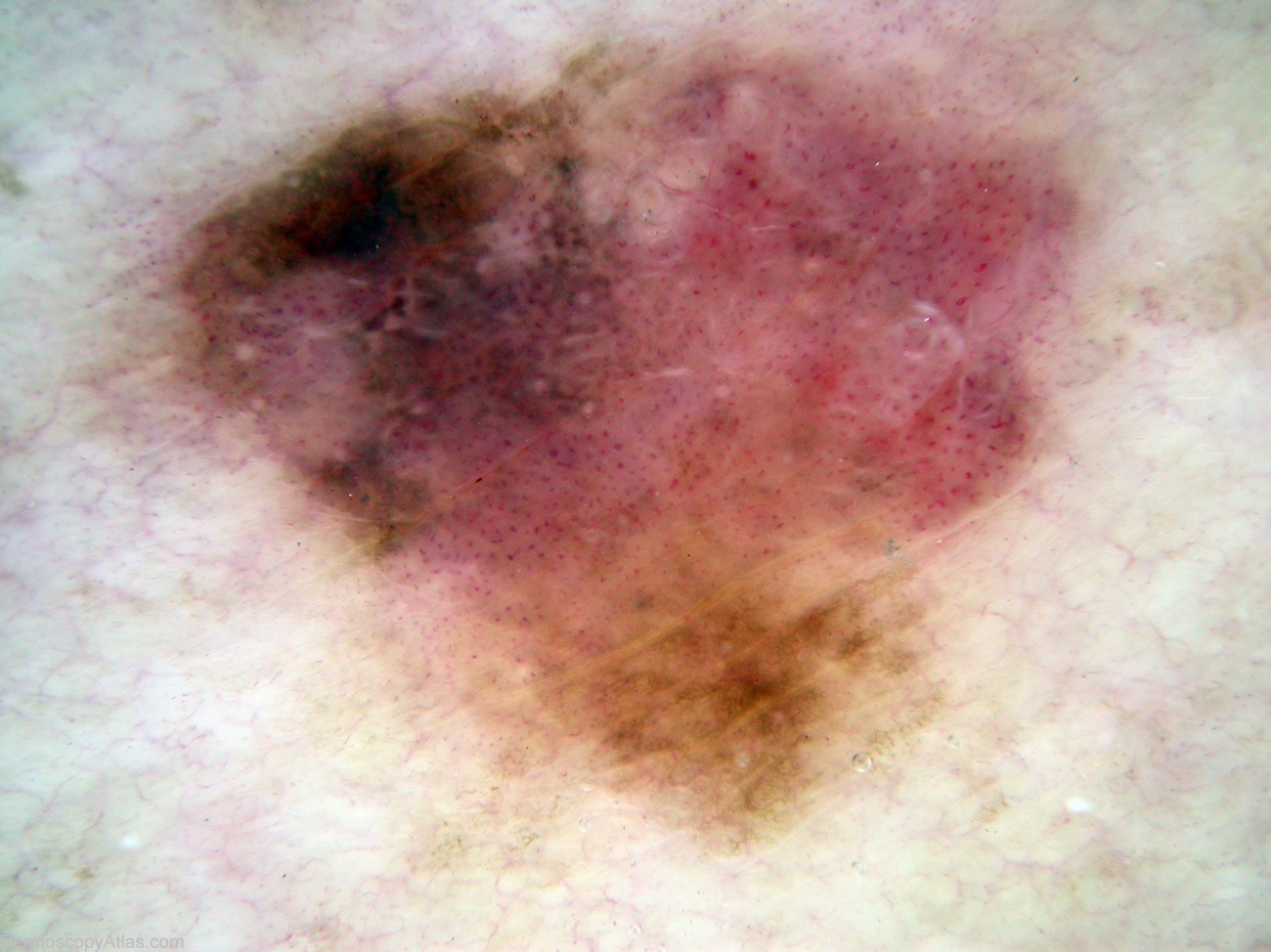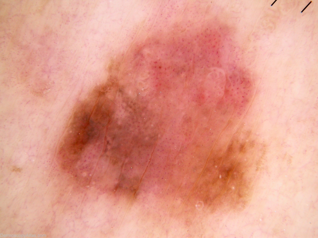 Description: The lesion shows patterns of lines reticular, structureless pink and structureless tan. Vessels are dot and polymorphous.