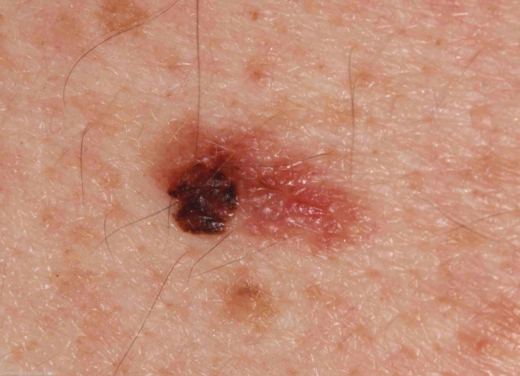 Description: Against the background of structureless tan lesion, a focus of thick lines reticular with irregular black and brown clods, and black dots peripherally (in this focus). Pattern in the superior portion of this focus is brown clods and not white lines reticular (negative network) as the lines are not lighter than surrounding skin.