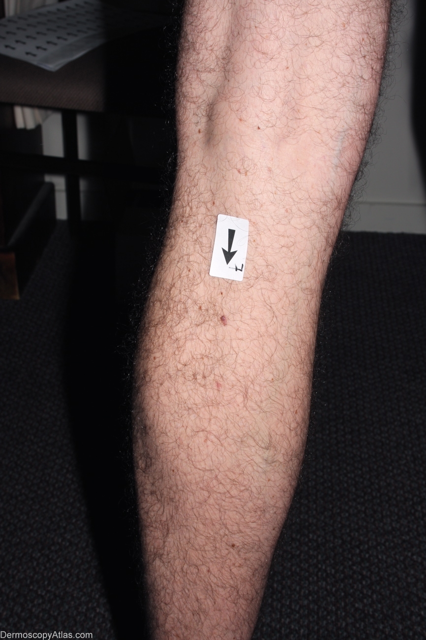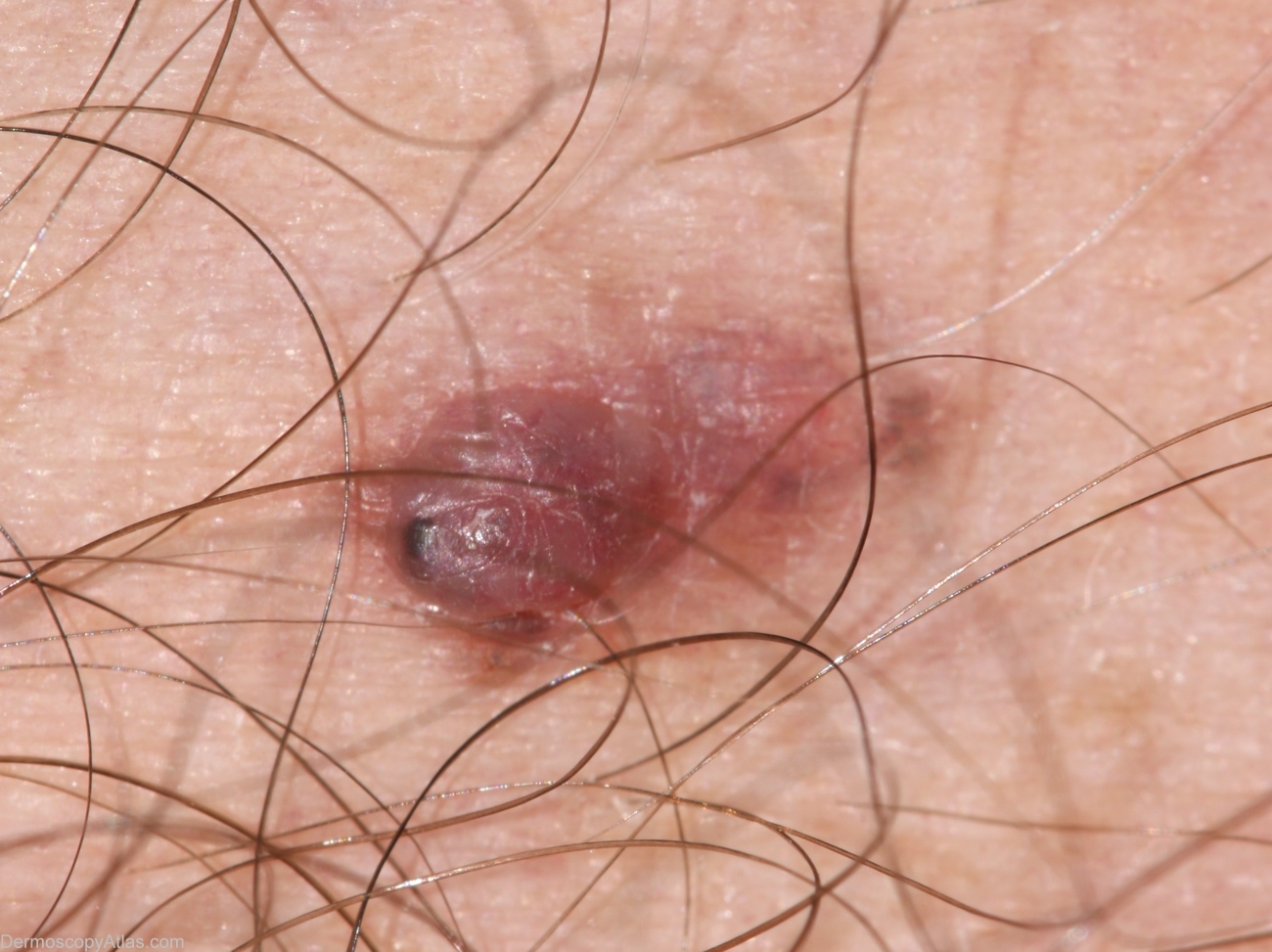 Description: The nodular component is not unlike a benign dermal naevus with maybe (in retrospect) more variability in vessel morphology and the unusual solitary brown clod. The macular component shows dots grey and more unusual fine hairpin vessels. Thes features suggest a (symptomatic) regressing melanocytic lesion.