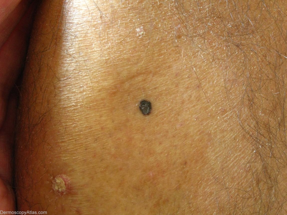 Description: A dark lesion, with a blue-white veil and irregular streaks. At 1 o'clock and 4 o'clock, drafts of grey leaf-like areas are visible.