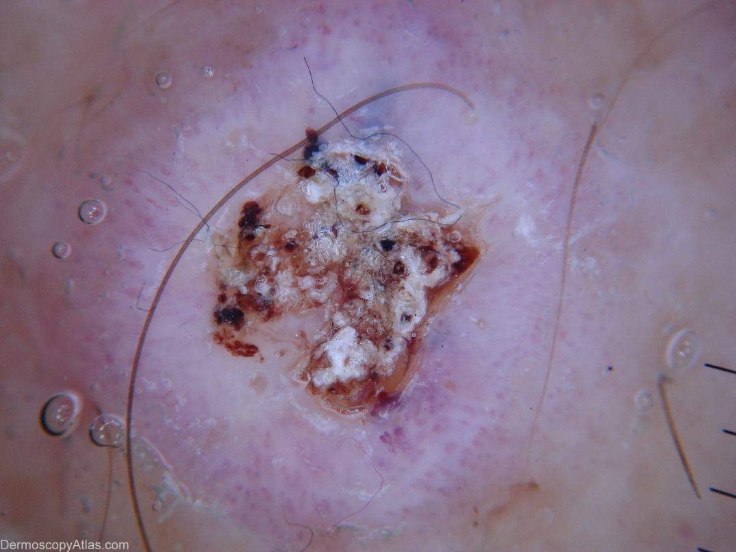History: Clinically typical KA with central crater and keratin plug, surrounding hairpin vessels with white halo. Histopathology confirmed a keratoacanthoma.