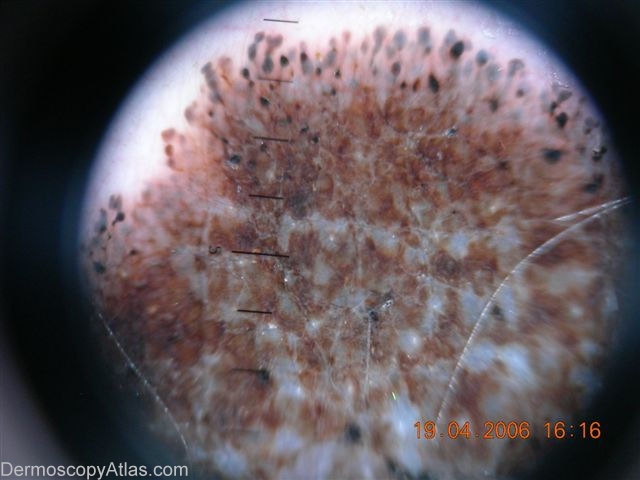 History: This 45-years -old man complained of an enlargin tumor on his leg a year ago.The lesion was excised, and pathology revealed Malignant Melanoma(4 mm breslow). The scar was reexcised with a 2 cm margin. sentinel node biopsy is negative. Dermoscopic description: Blue-white veil and irregular pseudopods