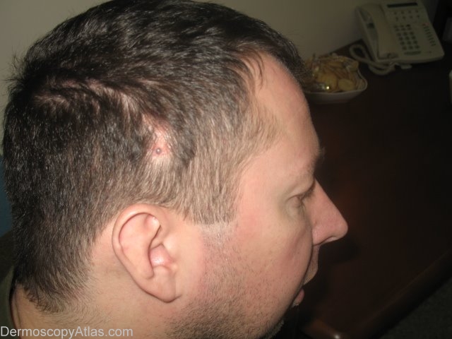 History: The 30 years old man developed a new lesion(see blue lesion) in his Nevus sebaceus since 3 months ago. .The path report of the new lesion was a Trichoblastoma. Dermoscopic description:Blue homogenous area. Trichoblastoma arising from Nevus sebaceus. Trichoblastoma is the benign variant of Basal cell carcinoma and the most frequent benign tumor arising from Nevus sebaceus is a trichoblastoma(Iris Zalaudek-see skincancerclinic.blogspot.com/).
