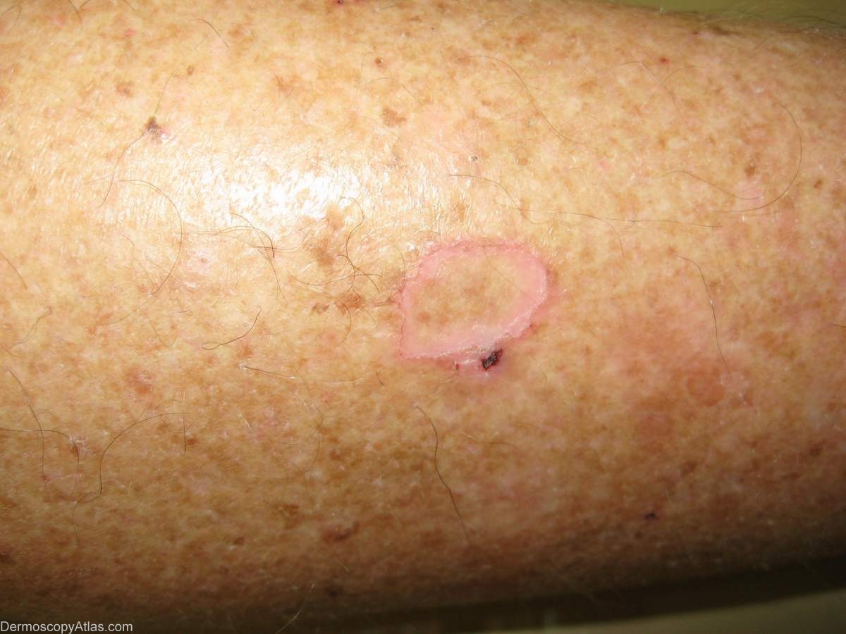 History: This was a solitary porokeratosis on a woman's leg. The dermoscopy shows an excellent peripheral coronoid lamella. Occassionally an SCC in situ can develope in the centre of one of these lesions.