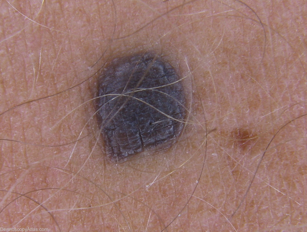 History: This 36 yr old male had a longstanding lesion on the leg without history of change. Dermoscopy show tones of brown as well as the more typical blue, a so called "Brown" Blue Nevus see Chapter III.4 Blue Nevus, Gerardo Ferrara and Giuseppe Argenziano in the Color Atlas of Melanocytic Lesions of the Skin, Springer, 2007