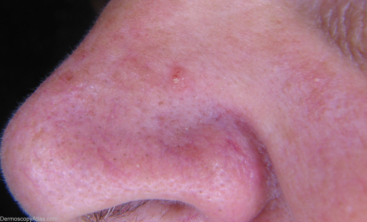 History: This patient presented with an enlarging scaly lesion on the nose. Dermosocpy showed surface scale and glomerular and hairpin vessels, histopathology undertaken to exclude Bowens Disease was of an irritated seborrhoeic keratosis