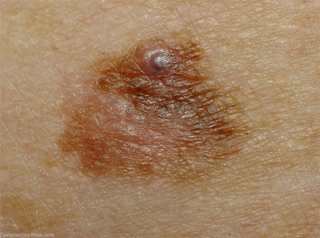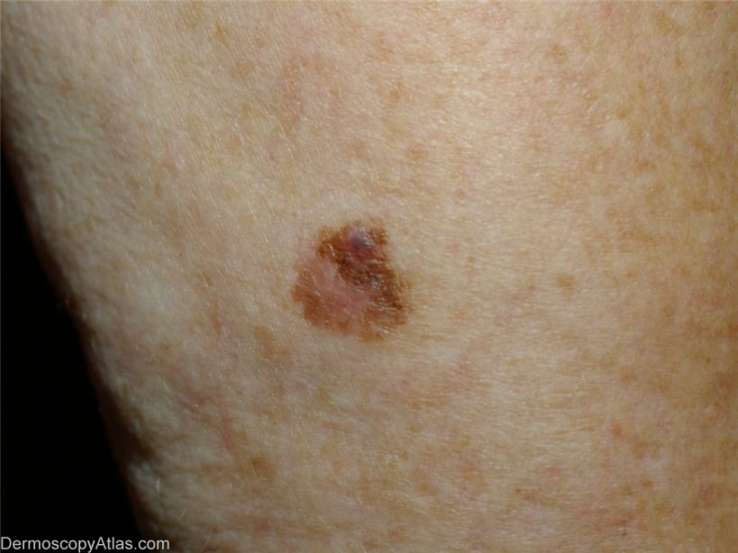 Description: Kittler <1p lines reticular and structureless combined asymmetrically. Clues; most obvious in macro with eccentric structureless zone, dot and curved vessels apparent to left of most pigmented area.