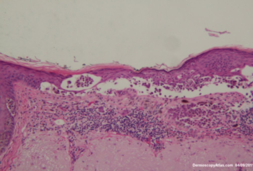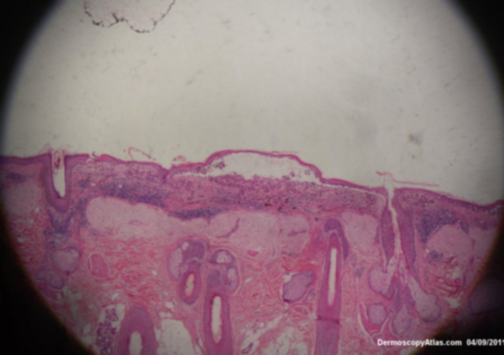 This lesion was noted fotuitously when the patient was having another procedure done on his back. Dermatoscopically it shows peripheral clods of varying sizes, multiple colours and on the enlarged dermatoscopic view some diffuse fine grey dots. It was an invasive melanoma Level 2 , 0.4mm in depth . The histology shows an unusual feature of acantholysis of the tumour nests.