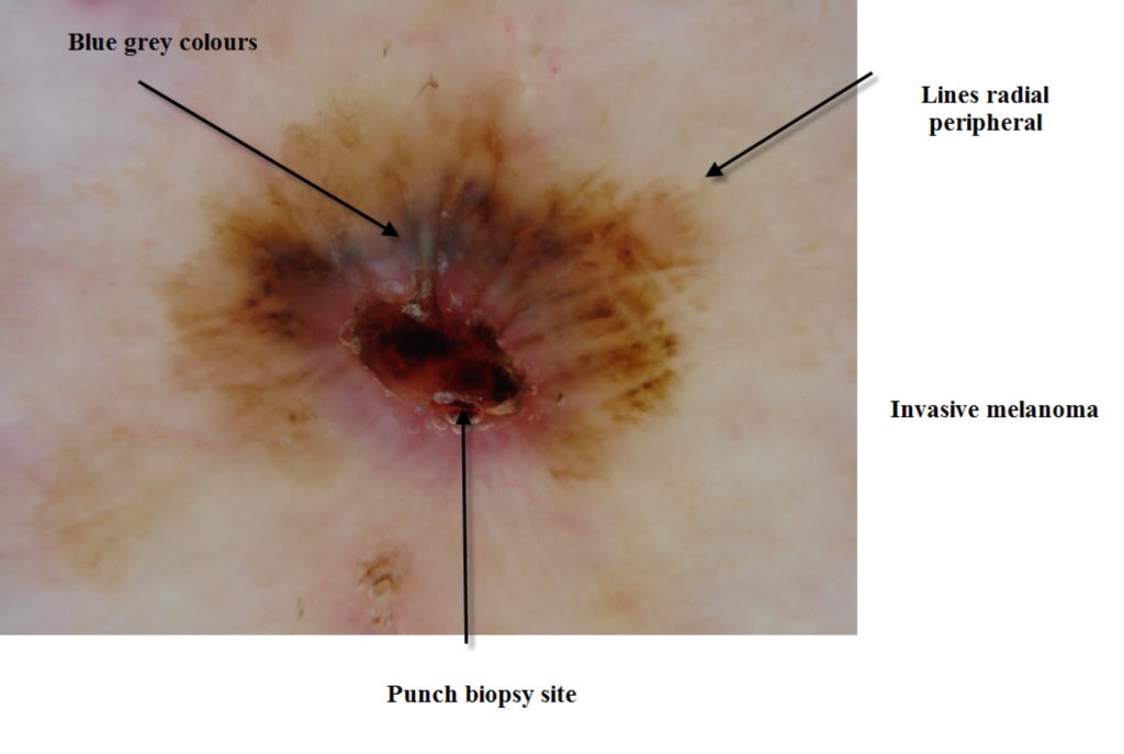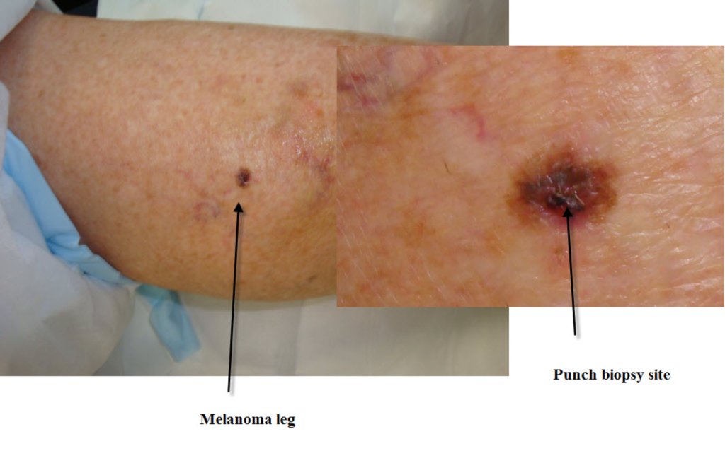 The main point of showing this is to emphasise that sampling pigmented lesions with a small punch biopsy is fraught with sampling error problems. Always excise with 2mm margins to allow the pathologist to see all the lesion.
