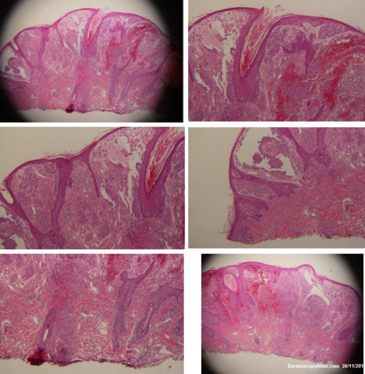 This lesion arose rapidly on the ear of a 5 years old male. The issue was whether it was a Spitz nevus or a traumatised hemangioma. The presence of small vessels within the pink clods ruled out hemangioma. The septae between the pink clods represent the white lines seen in some Spitz nevi. The histology shows a disrupted Spitz nevus with some hemorrhage into the nests and acantholysis. Usually you just see some clefting around the nests in Spitz nevi.