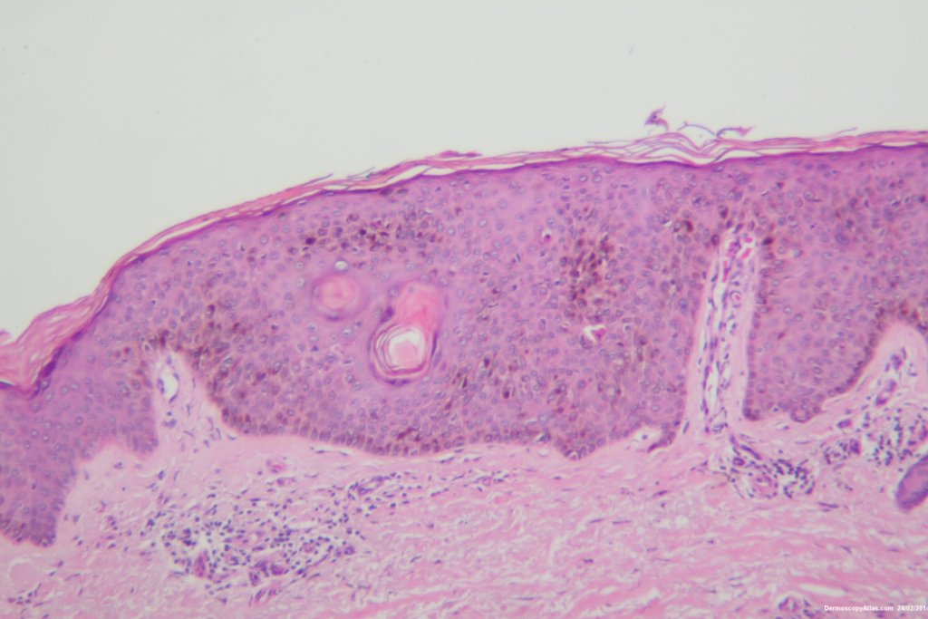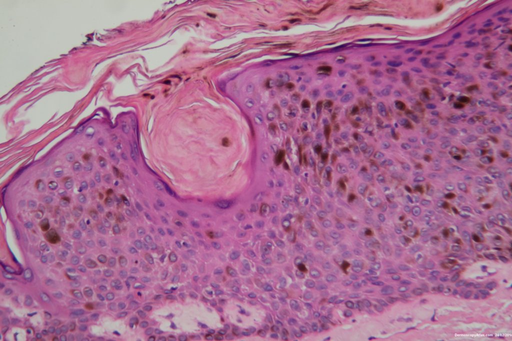 The histology shows a heavily pigmented seborrhoeic keratosis with pigment cells being seen in the stratum corneum explaining the black colour.