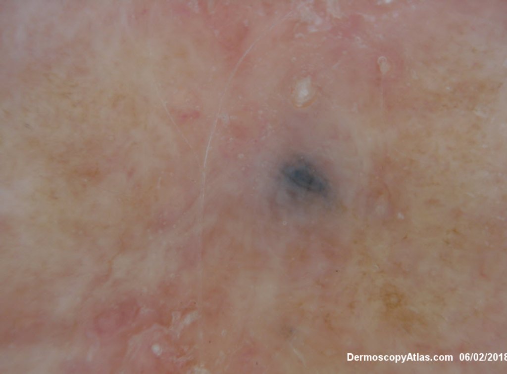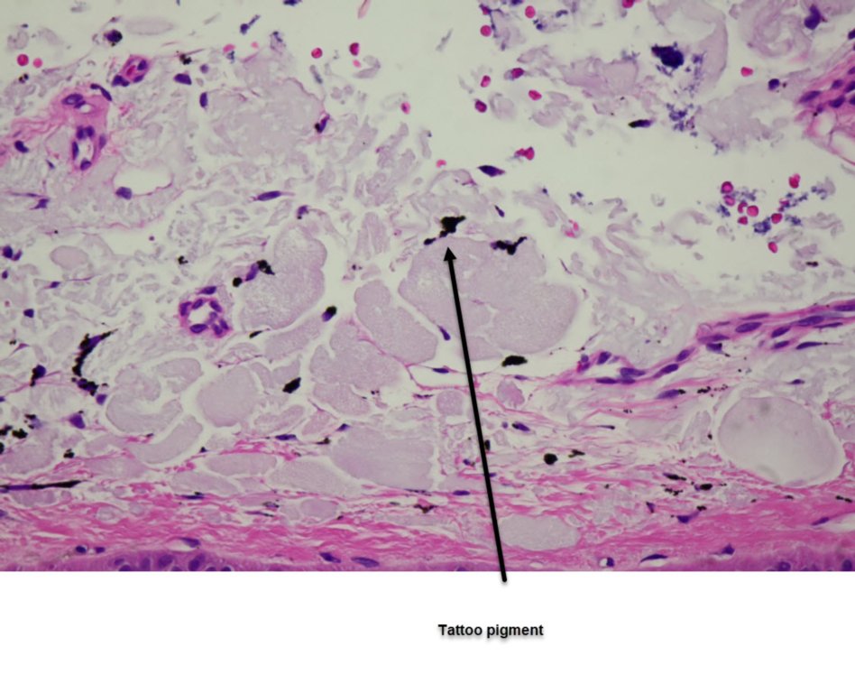 Man aged 84, previous melanomas including blue nevus like metastatic melanomas on the leg which I presented last year. This time he comes in pointing out 3 blue lesions on his forearm. He denied seeing them before and they had not previously been noted when a skin check was performed. It was thought they were metastatic but histology of all three showed dermal pigmentation of a tattoo.