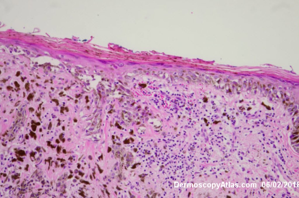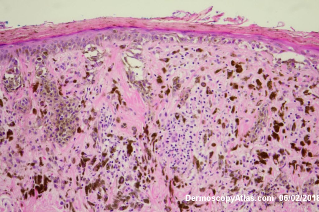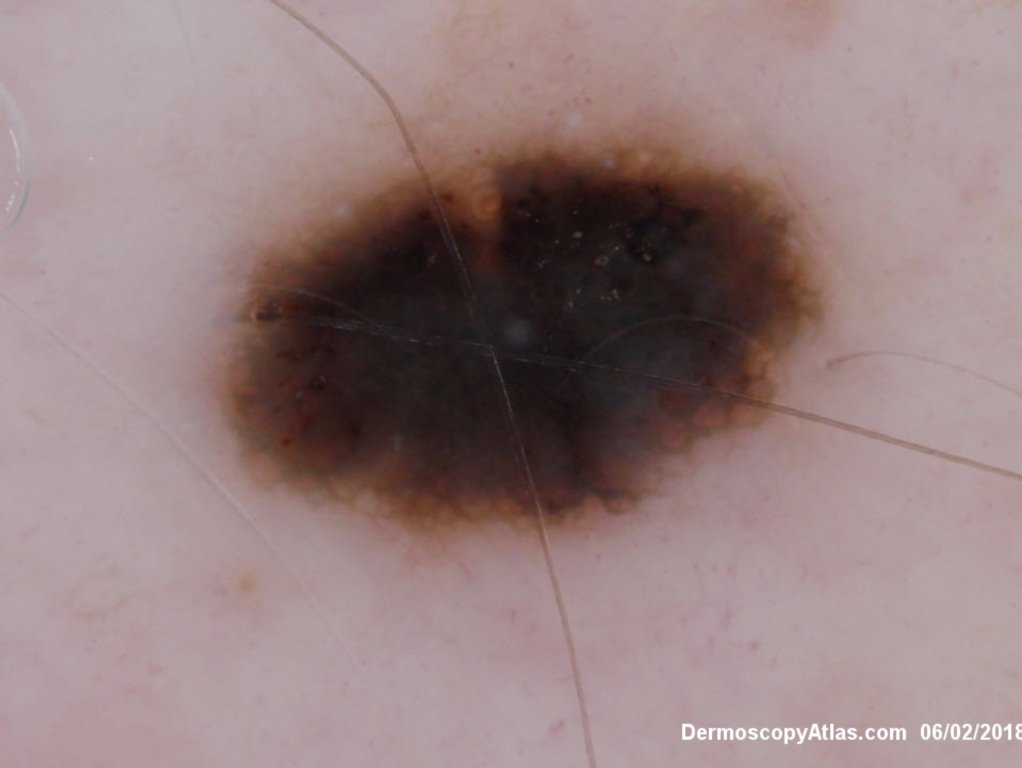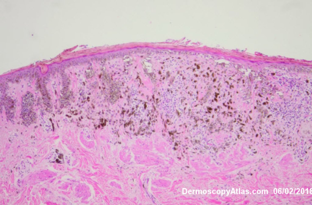 Routine skin check of a male in late 60s with this pigmented lesion on the lower back. Not aware of it. Clinically it stood out because it was much darker than his other nevi.