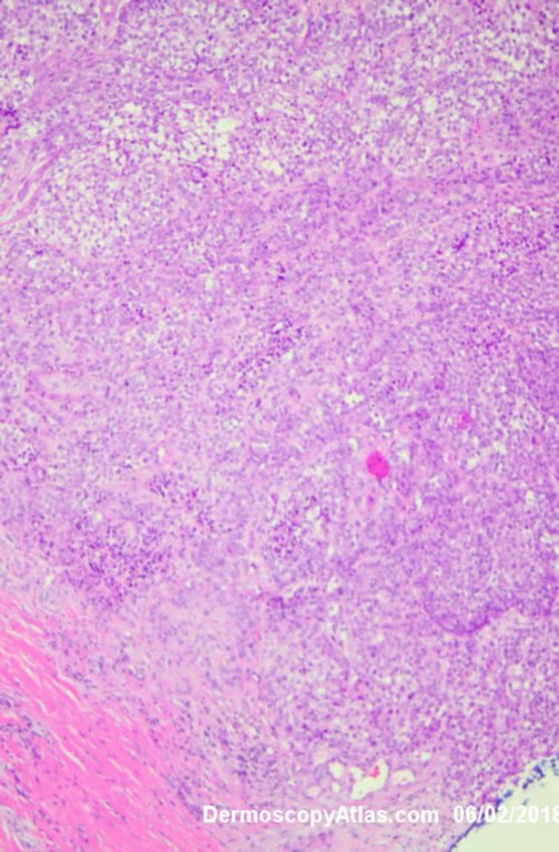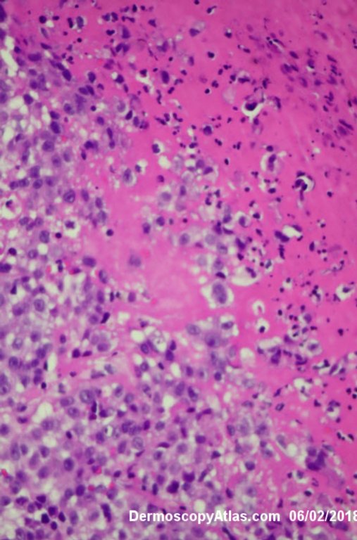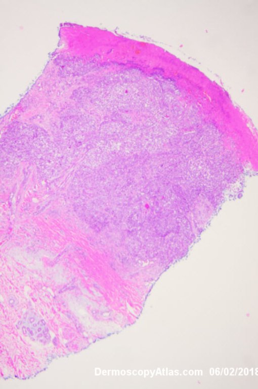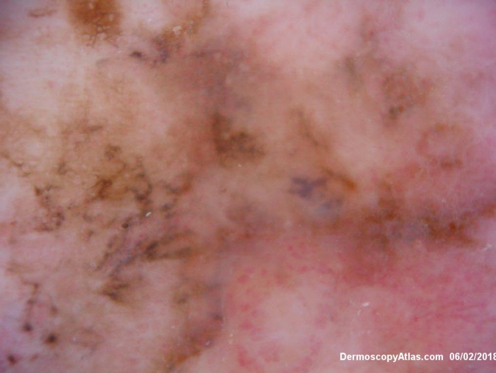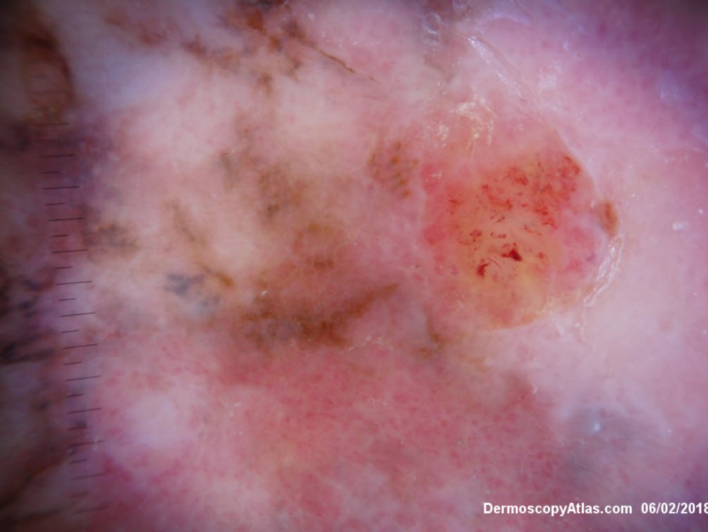 Lady in her early 80s who presented with this lesion on her ankle. The pigmented area had been there for some time but the pink area was bleeding and new. Shave of surrounding area and a punch biopsy of the new pink area showed mainly surrounding in situ melanoma with invasive melanoma in the pink area 1.8 mm thick. Having a 2cms margin excision of the whole area and a graft.