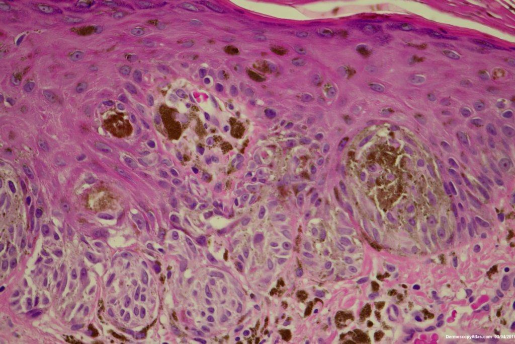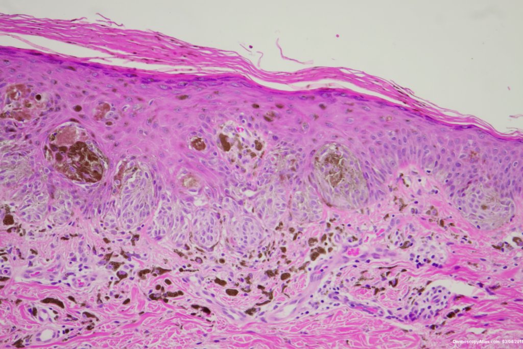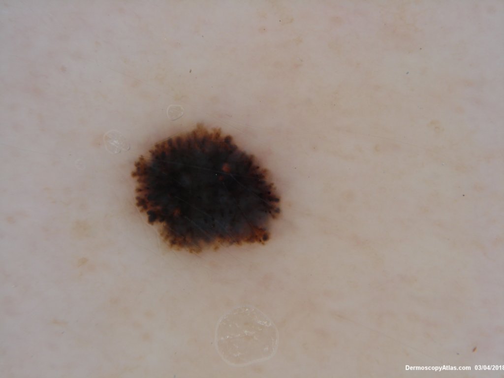Sudden onset of a new pigmented lesion on the shoulder. Dermatoscopy shows an actively proliferating lesion with peripheral pseudopods that involve most of the circumference. Clinically this was either a Reed nevus or a Spitzoid melanoma. The histology favours a Reed nevus.