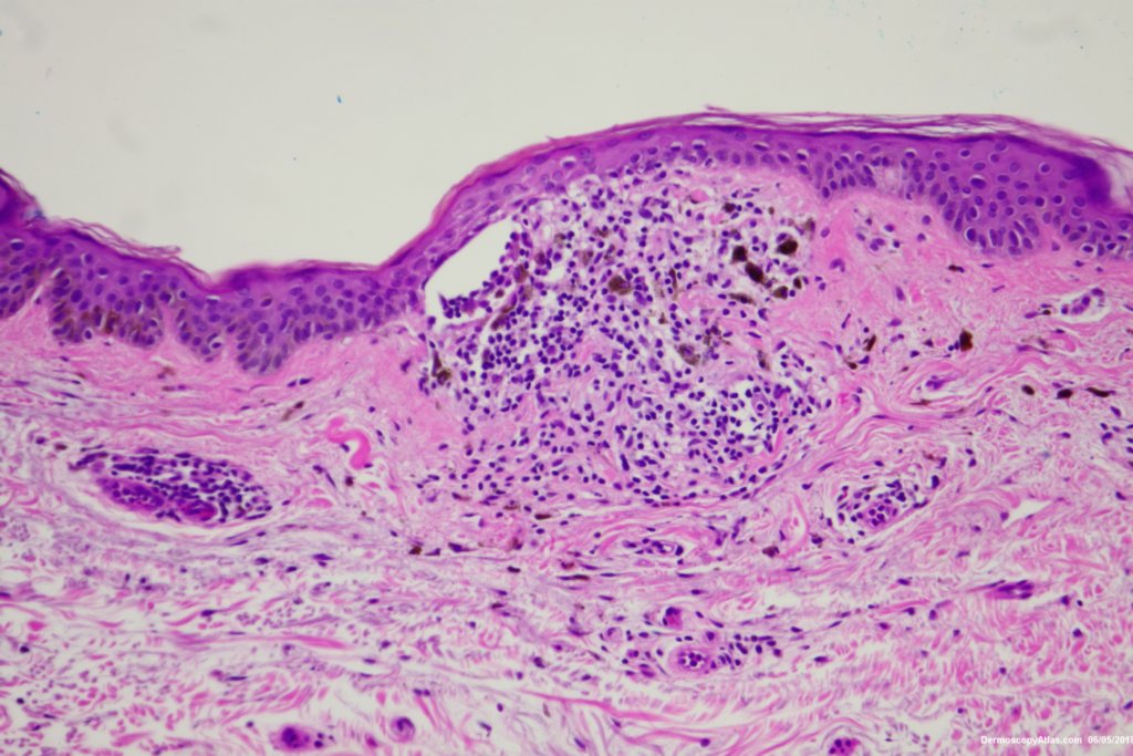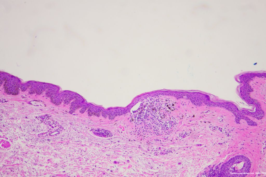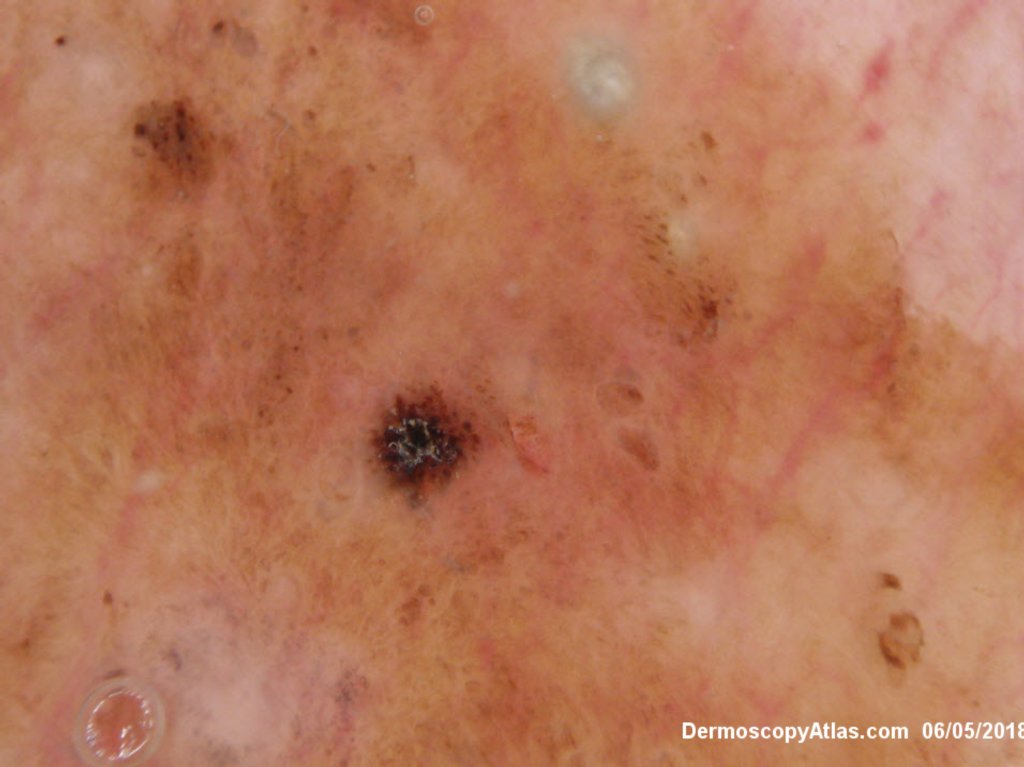 The dark areas within this seborrhoeic keratosis were dark keratin cysts. There is an associated lichenoid reaction at areas.