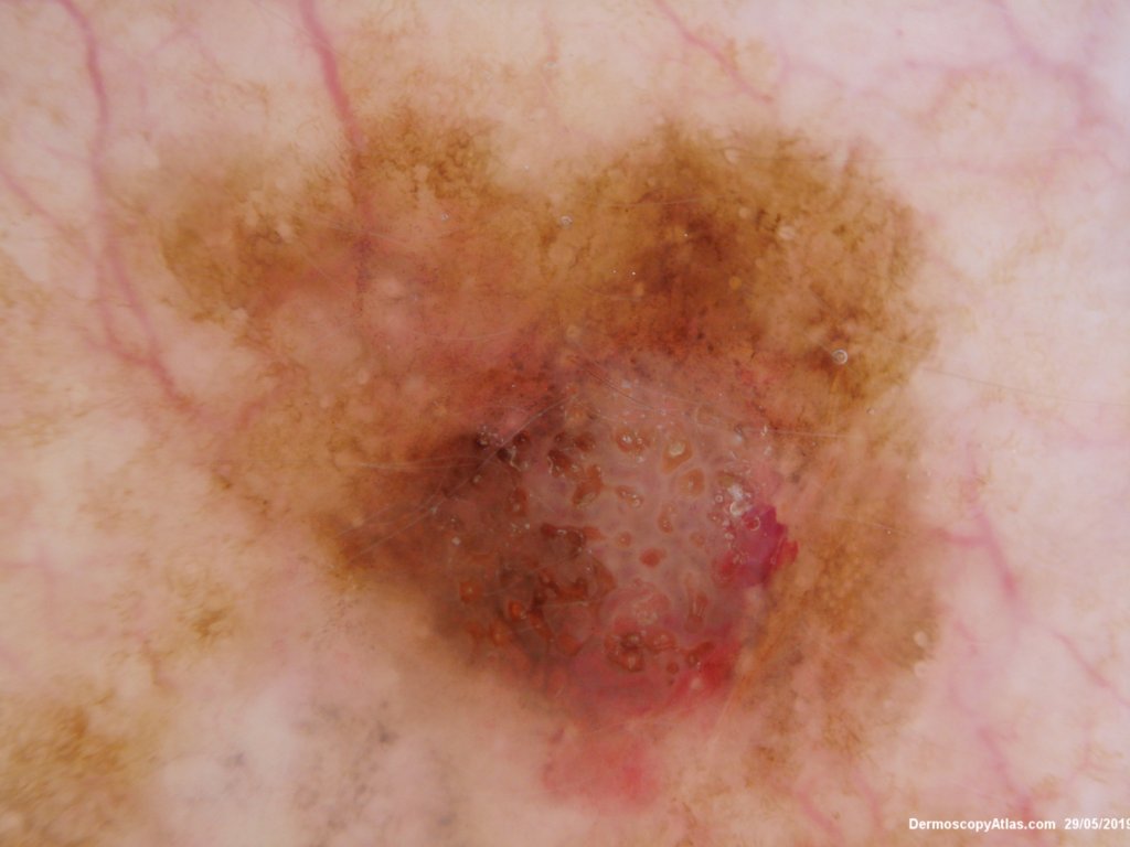 The dermatoscopy shows grey dots of regression and the orange clods in the seb K but there is also some hemorrhage within the Seb k and pigment occluding part of it.